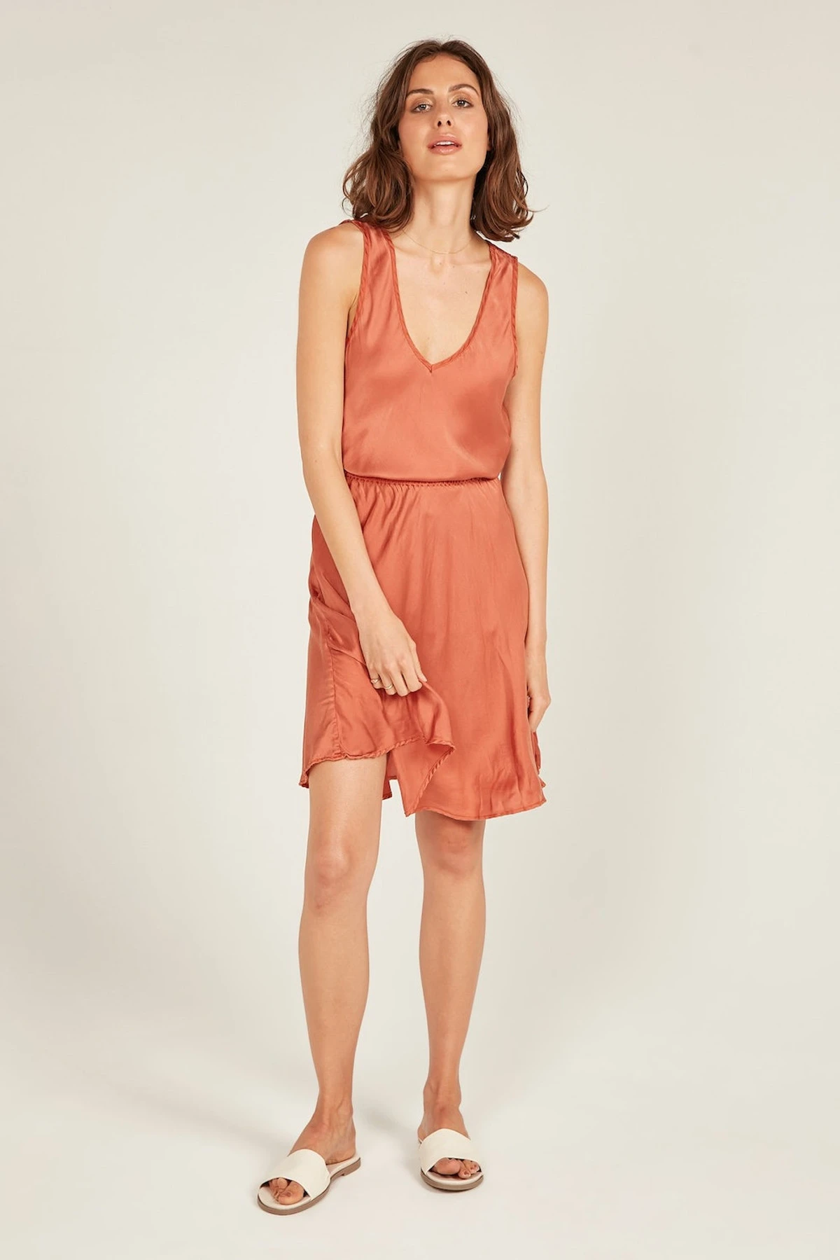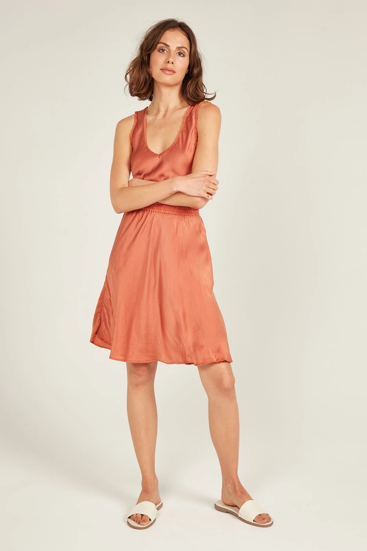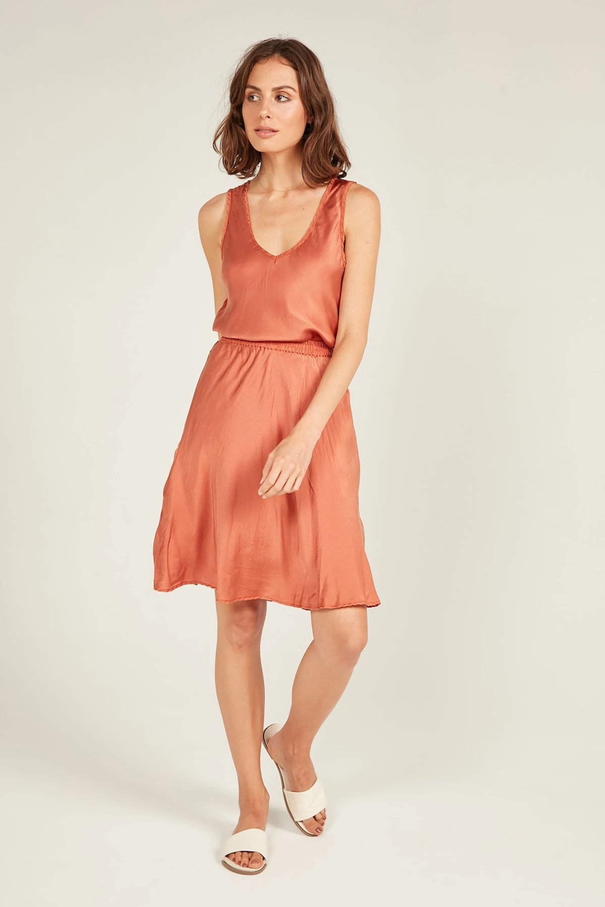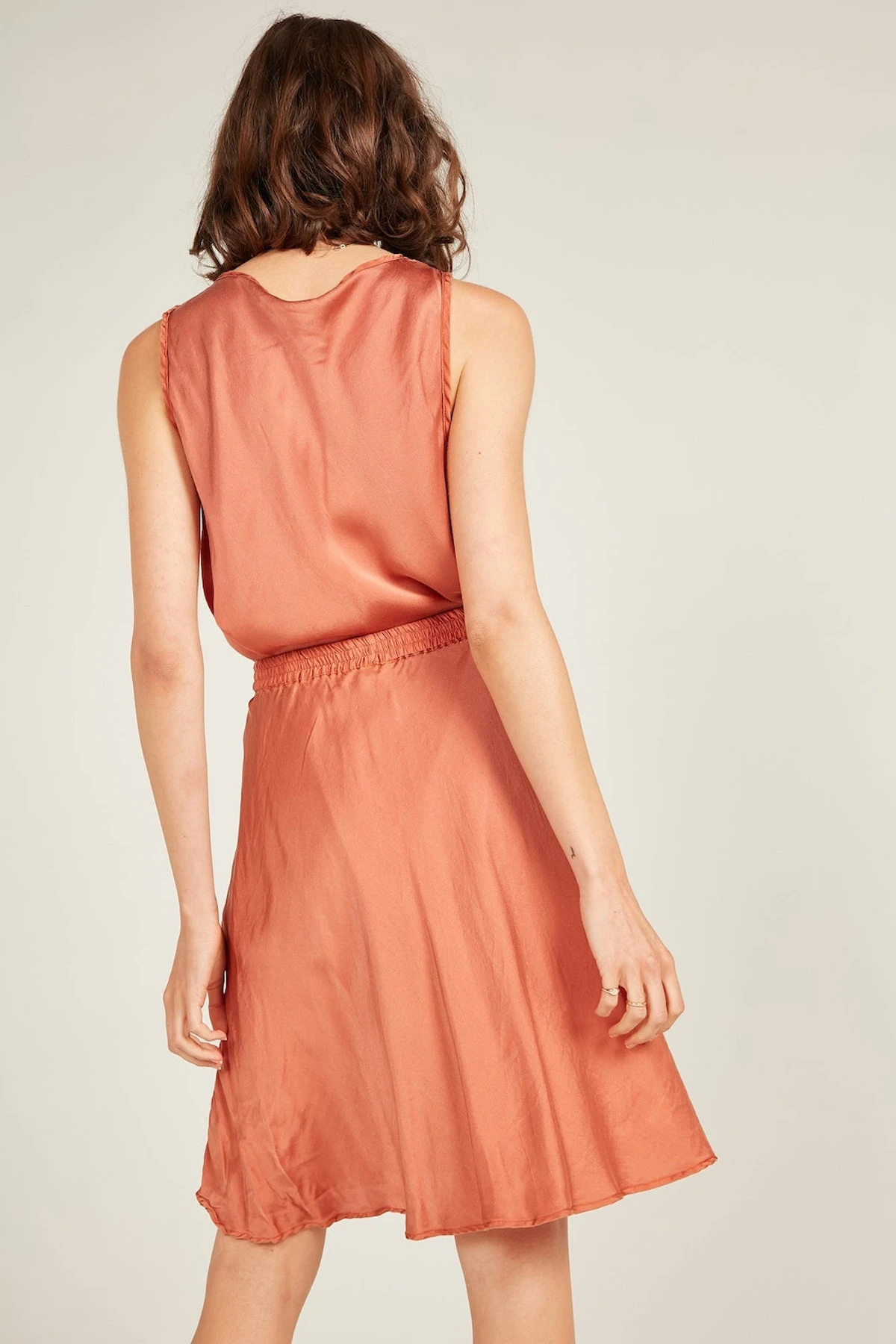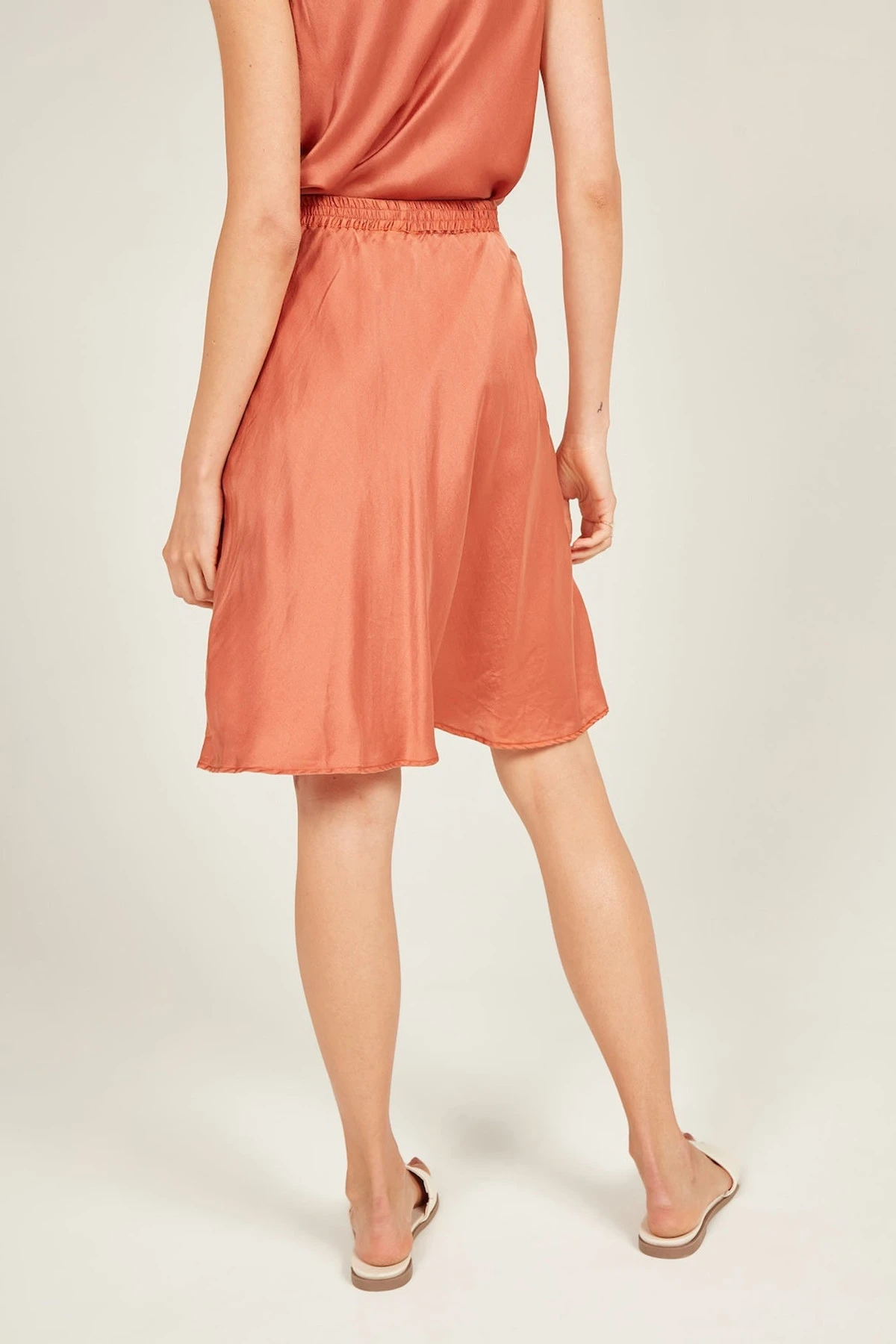 The Bias Skirt in our dreamy satin silk features a flattering bias cut. Elasticised waist with triple stitch detail for the ultimate comfort, falls above the knees. Beautifully french seamed and top stitched. Pair with our Obsession Tank for the perfect set or dress it down with a cami.