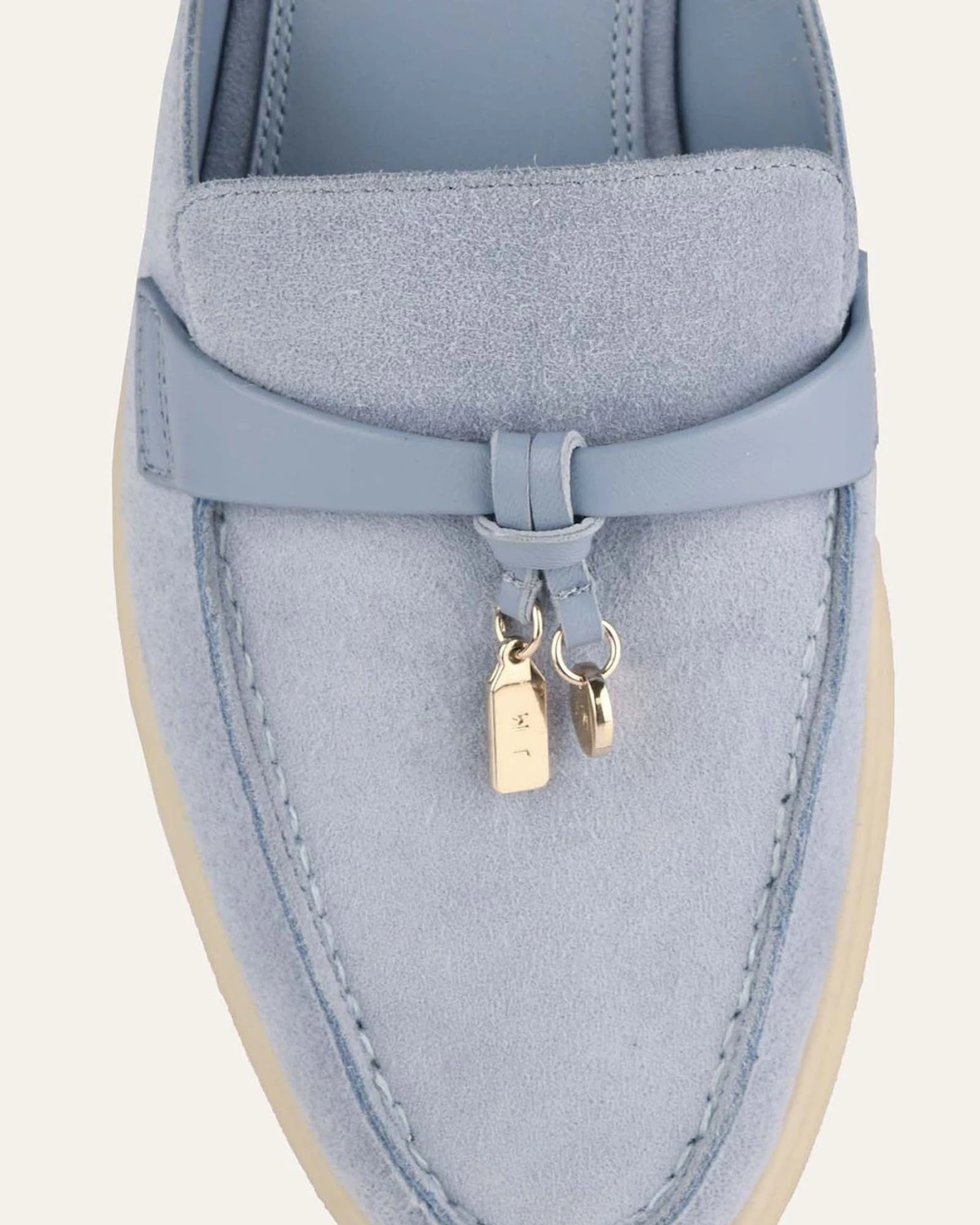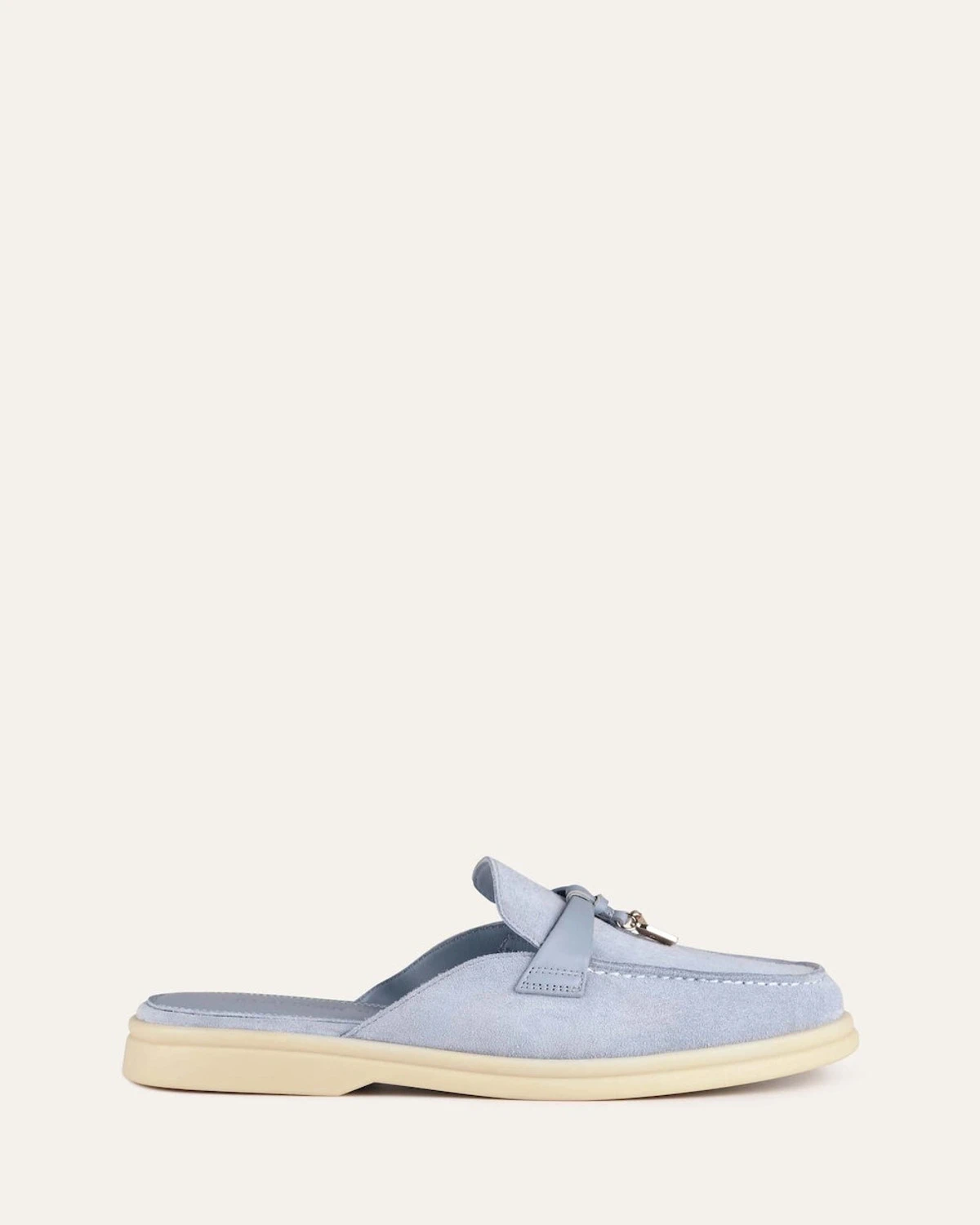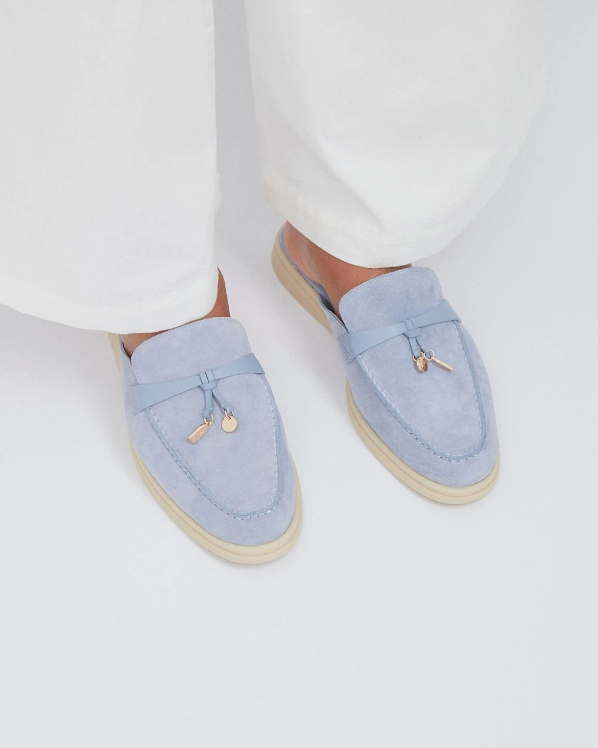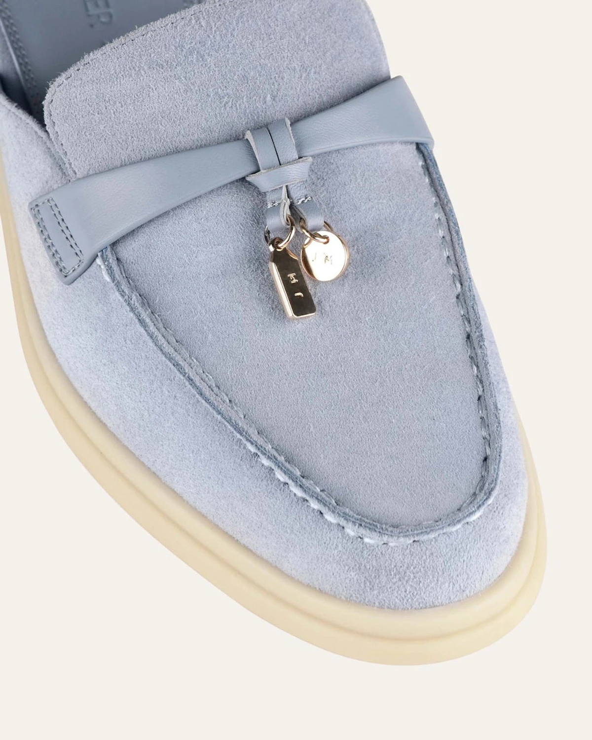 Experience unrivalled comfort with CAMBRIDGE. Crafted with care in luxurious soft kid suede they boast a soft kid leather lining, open back and distinctive moccasin stitch detail. Adorned with gold JM monogram trims, these shoes feature a unique slip-resistant flexi sole and are available in seasonal shades’. They exude relaxed luxury, making them a versatile choice for any occasion.¬â€ÂÂ