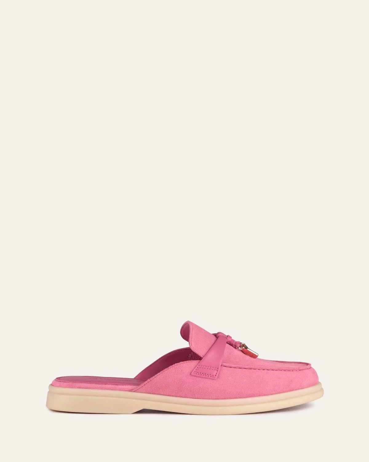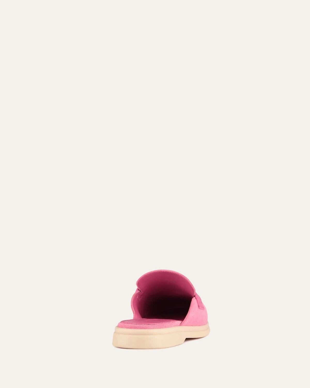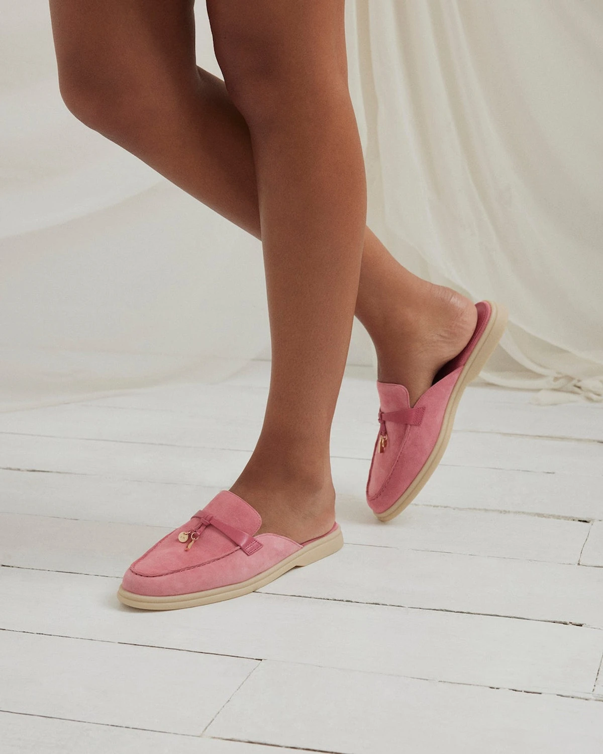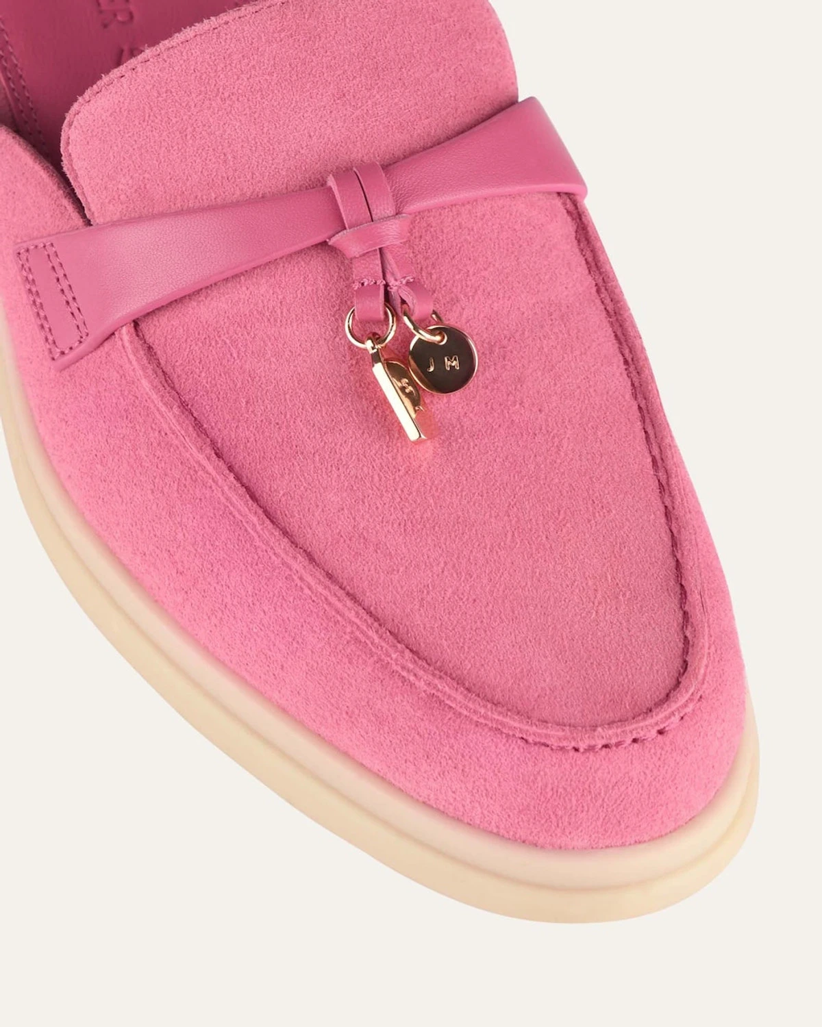 Experience unrivalled comfort with CAMBRIDGE. Crafted with care in luxurious soft kid suede they boast a soft kid leather lining, open back and distinctive moccasin stitch detail. Adorned with gold JM monogram trims, these shoes feature a unique slip-resistant flexi sole and are available in seasonal shades’. They exude relaxed luxury, making them a versatile choice for any occasion.¬â€ÂÂ
