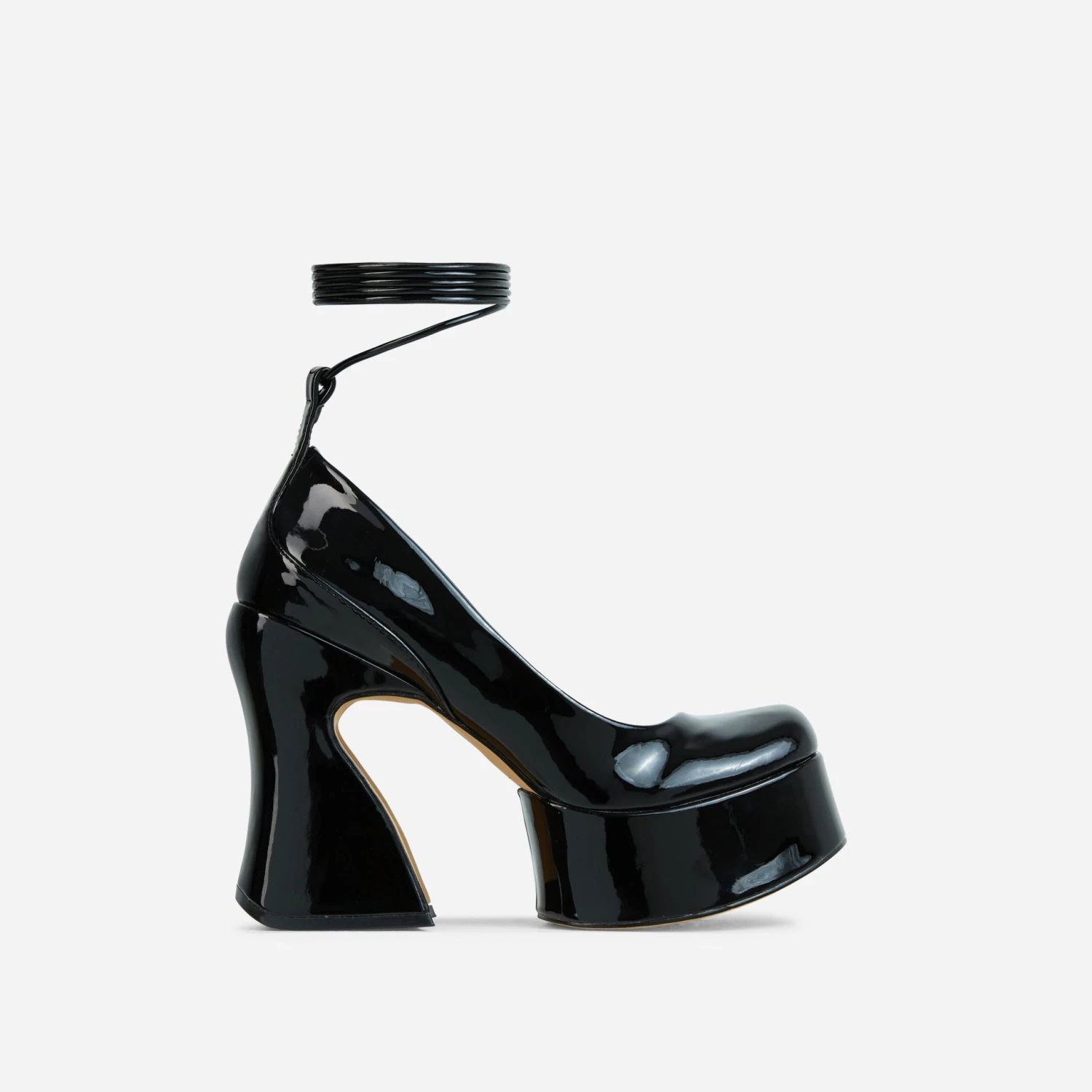 Girl, these statement heels are what your wardrobe needs. Featuring a black patent material, with a closed square toe, a statement platform block heel and a lace up finish.