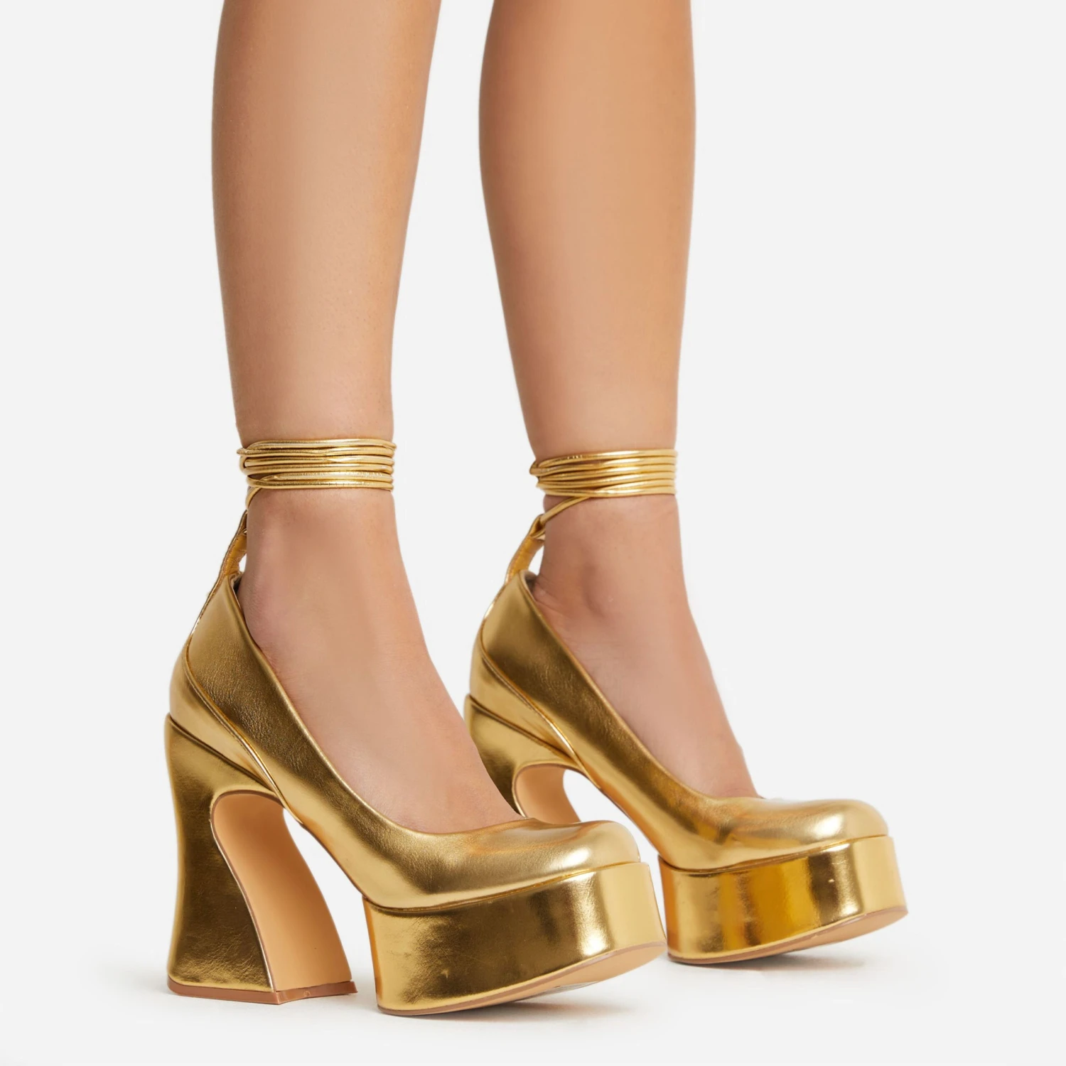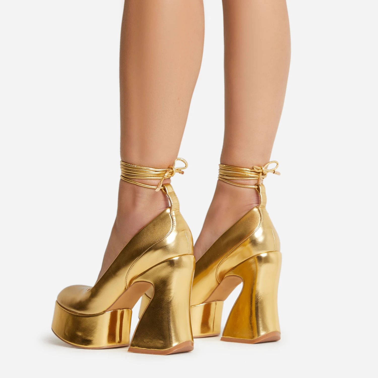 Make a bold entrance with these statement heels. Featuring a gold faux leather material, with a closed square toe, a statement platform block heel and a lace up finish.