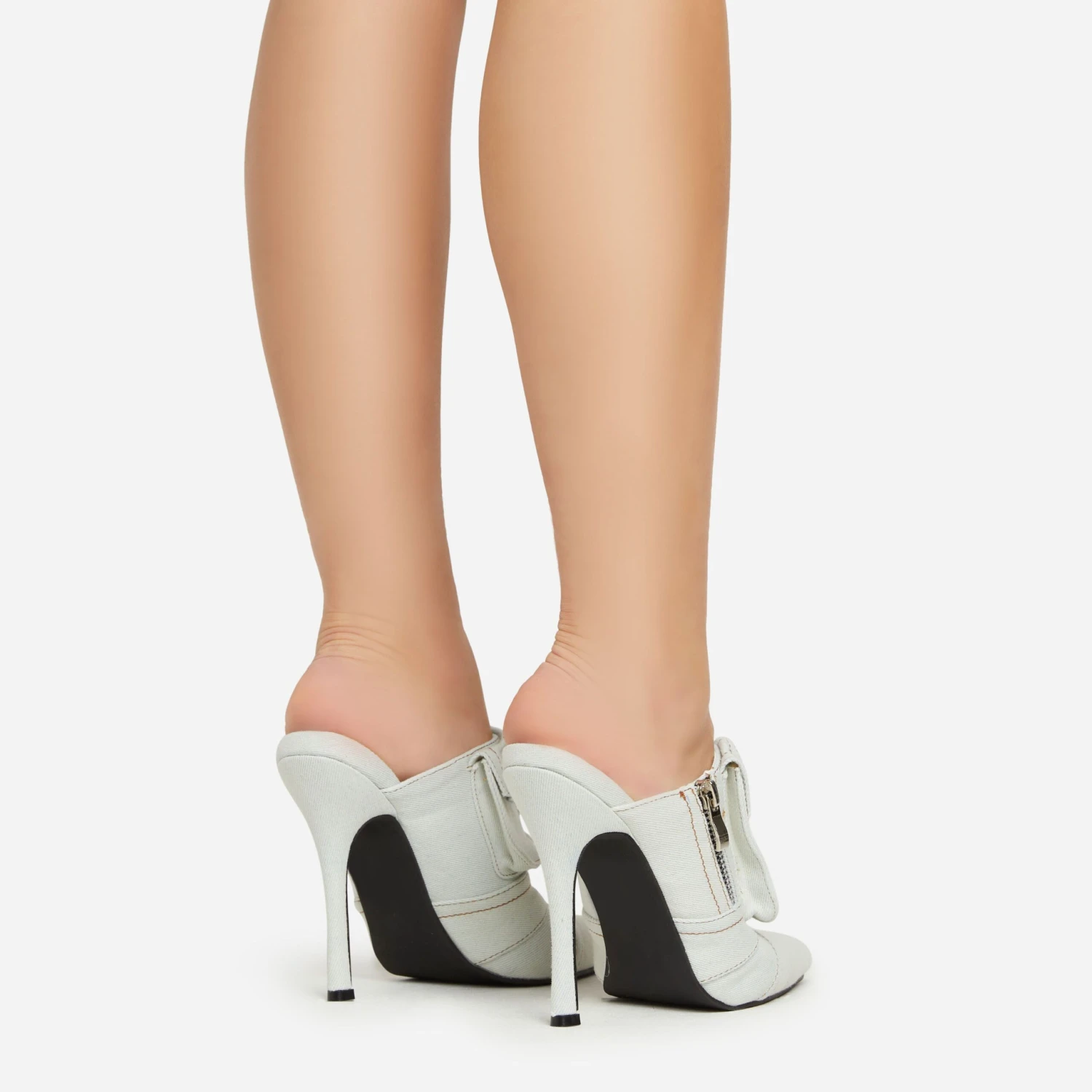 Earn some serious style points with these heels doll. Featuring a light blue denim material, a zip detailing, a pointed toe and a stiletto heel.