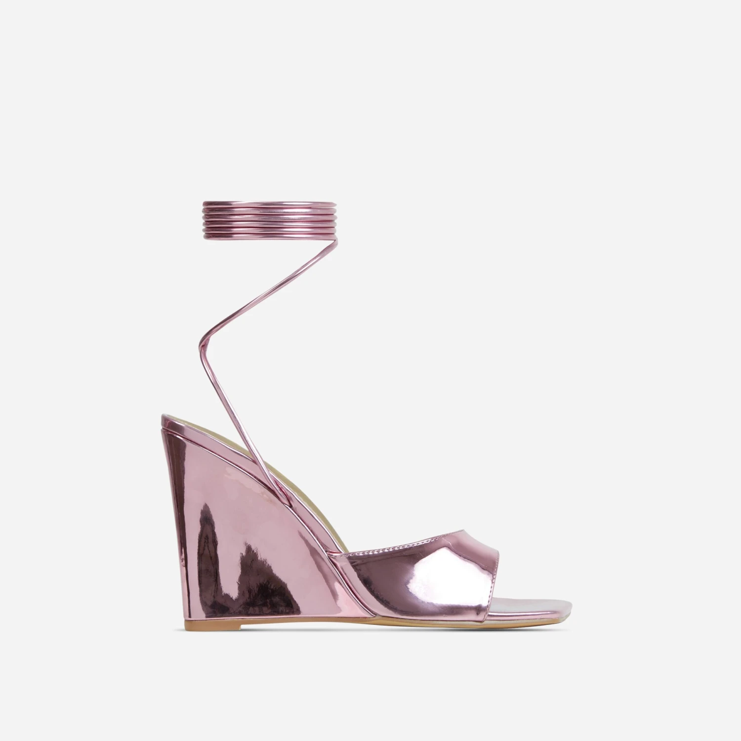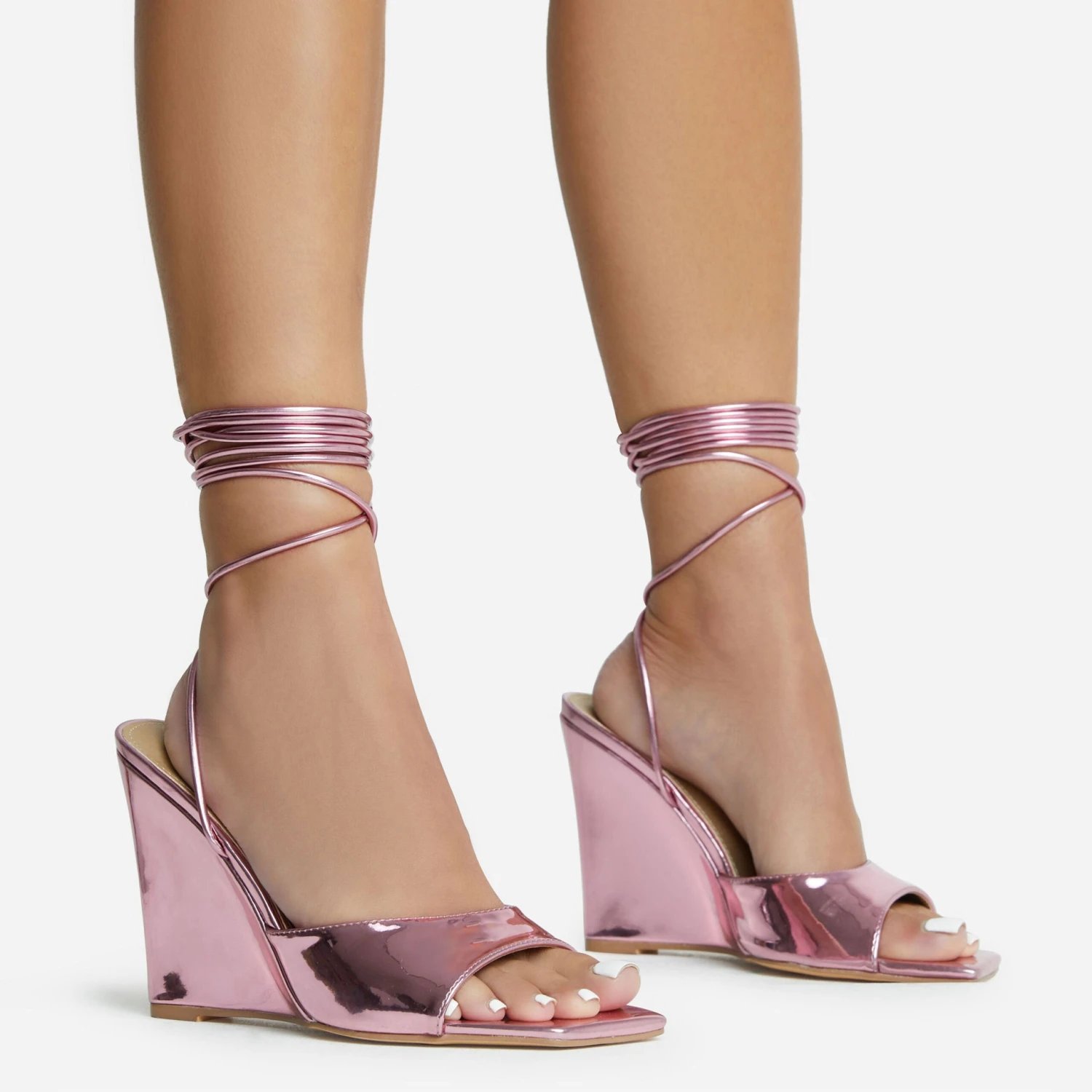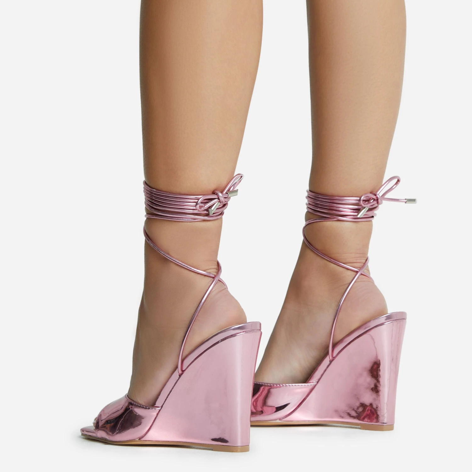 We are obsessing over these boujee heels. Featuring a pink metallic faux leather material, with a square peep toe, a wedge heel and a lace up finish.