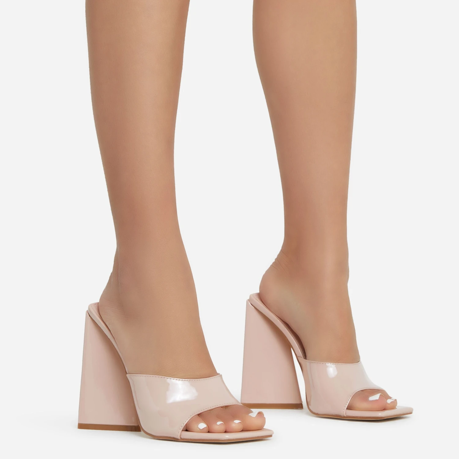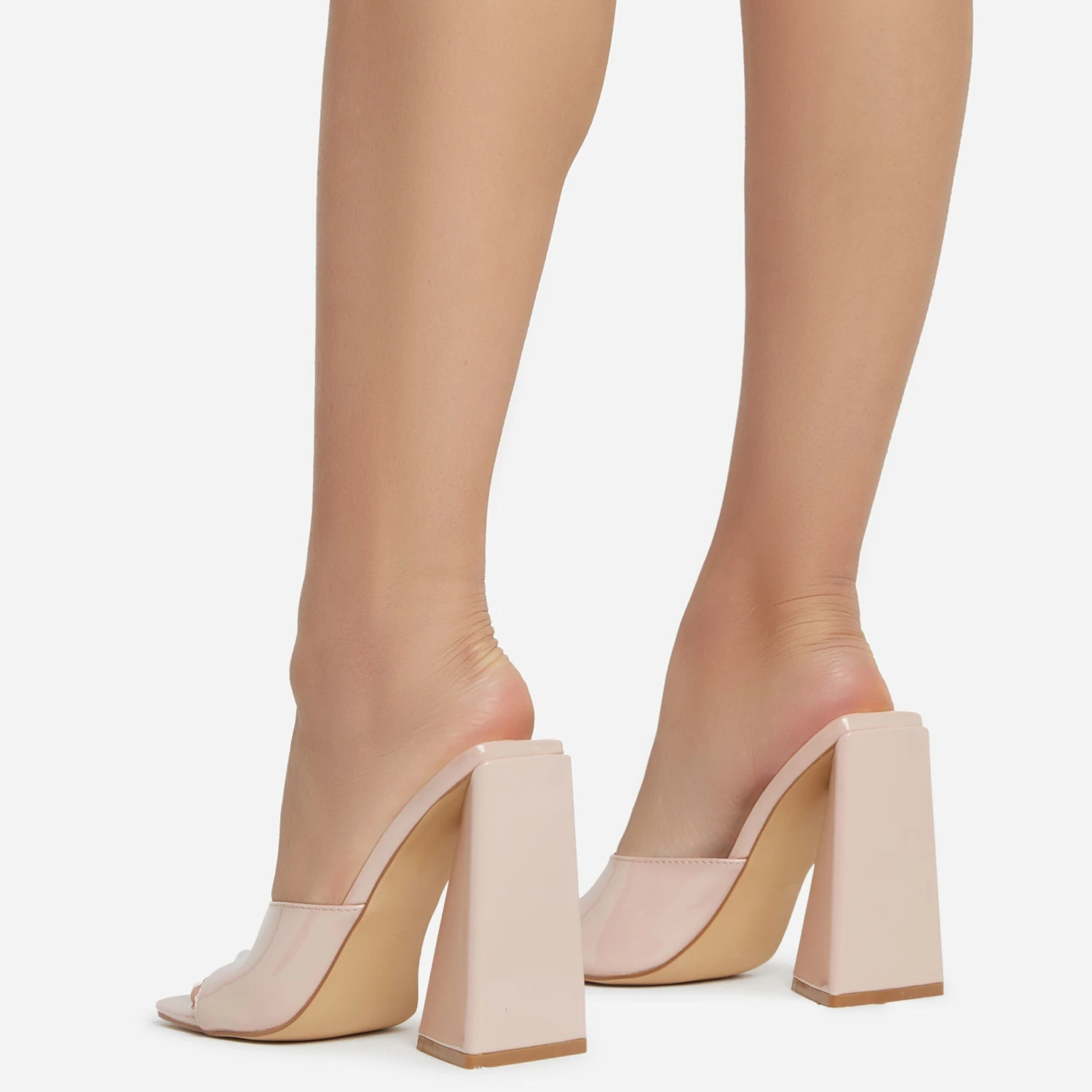 New In neutrals you NEED. Featuring a nude patent material, with a sculptured flared block heel in a mule design. We are obsessed.