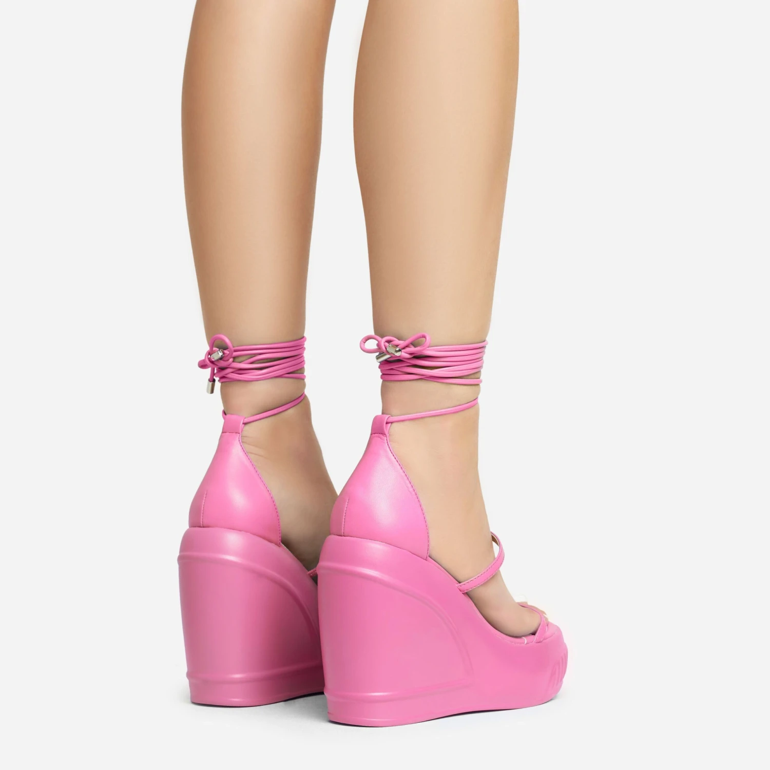 Give your boujee look a serious update. Featuring a pink faux leather and rubber material, with strappy detailing, a platform wedge heel and a lace up finish.
