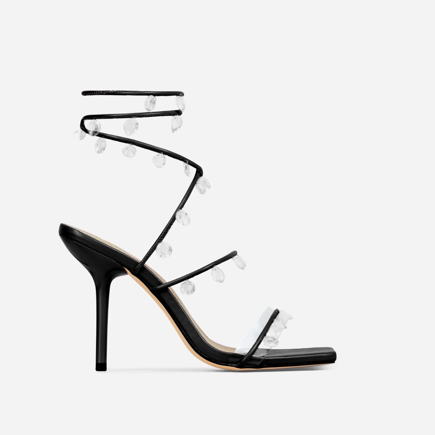 It’s officially party season and we are here for it. Featuring a black faux leather material, with clear gem detailing, a square toe, stiletto heel and a lace up finish.