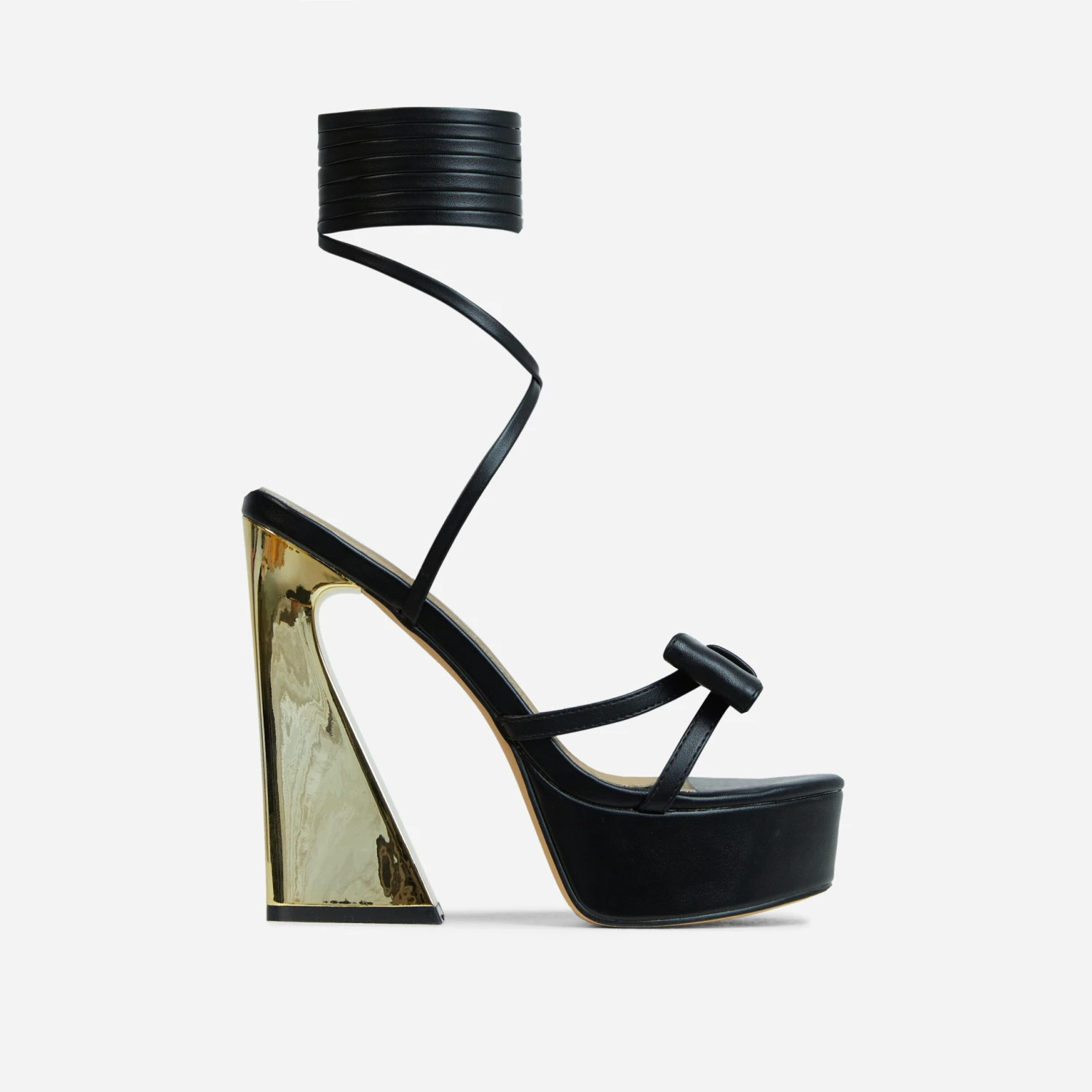 Level up your weekend look with these statement heels. Featuring a black faux leather material, with bow detailing, a platform sole, metallic flared block heel and a lace up finish.