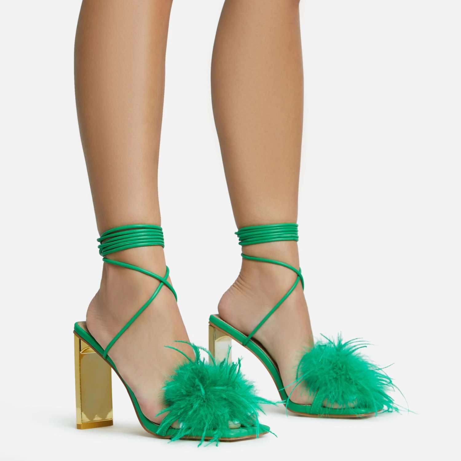 Add a pop of colour to your evening look doll. Featuring a green faux leather material, with faux feather detailing, a metallic thin block heel, square toe and a lace up finish.