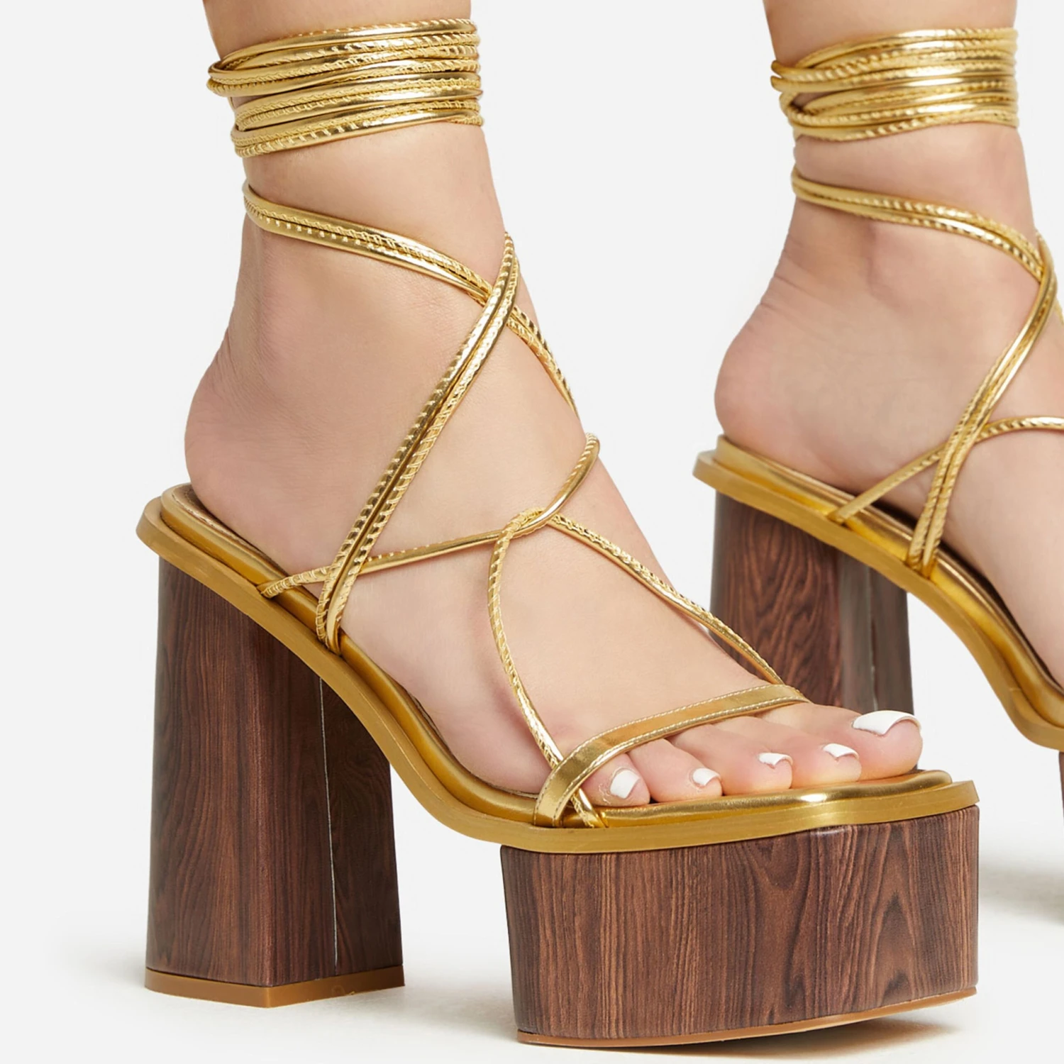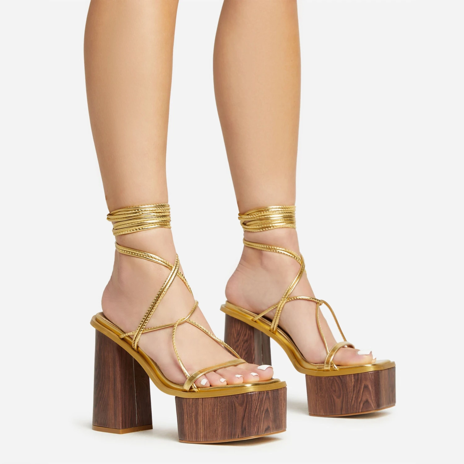 Girl, get yourself noticed in these statement heels. Featuring a gold faux leather material, with strappy detailing, a wood effect platform block heel and a lace up design.