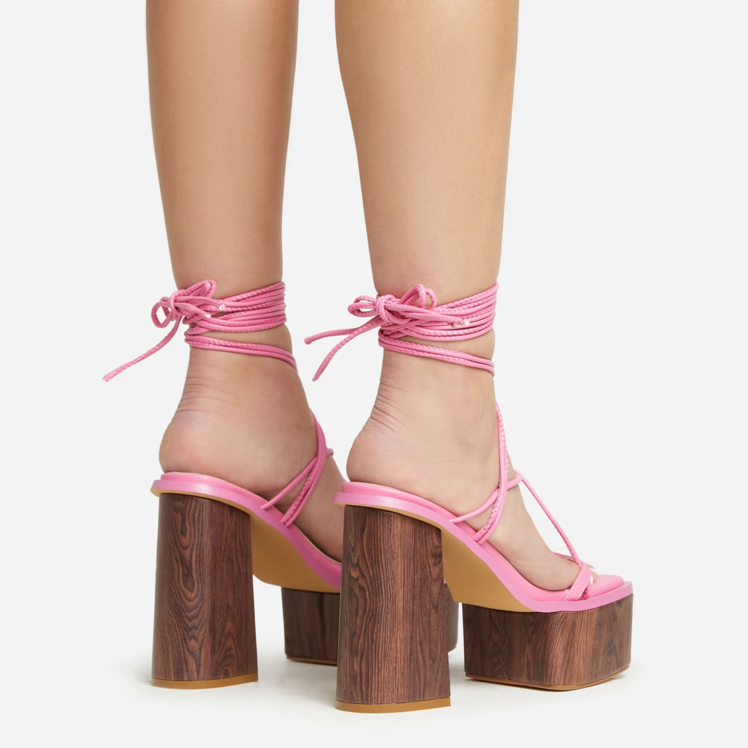 Add a boujee touch to your evening look doll. Featuring a pink faux leather material, with strappy detailing, a wood effect platform block heel and a lace up design.