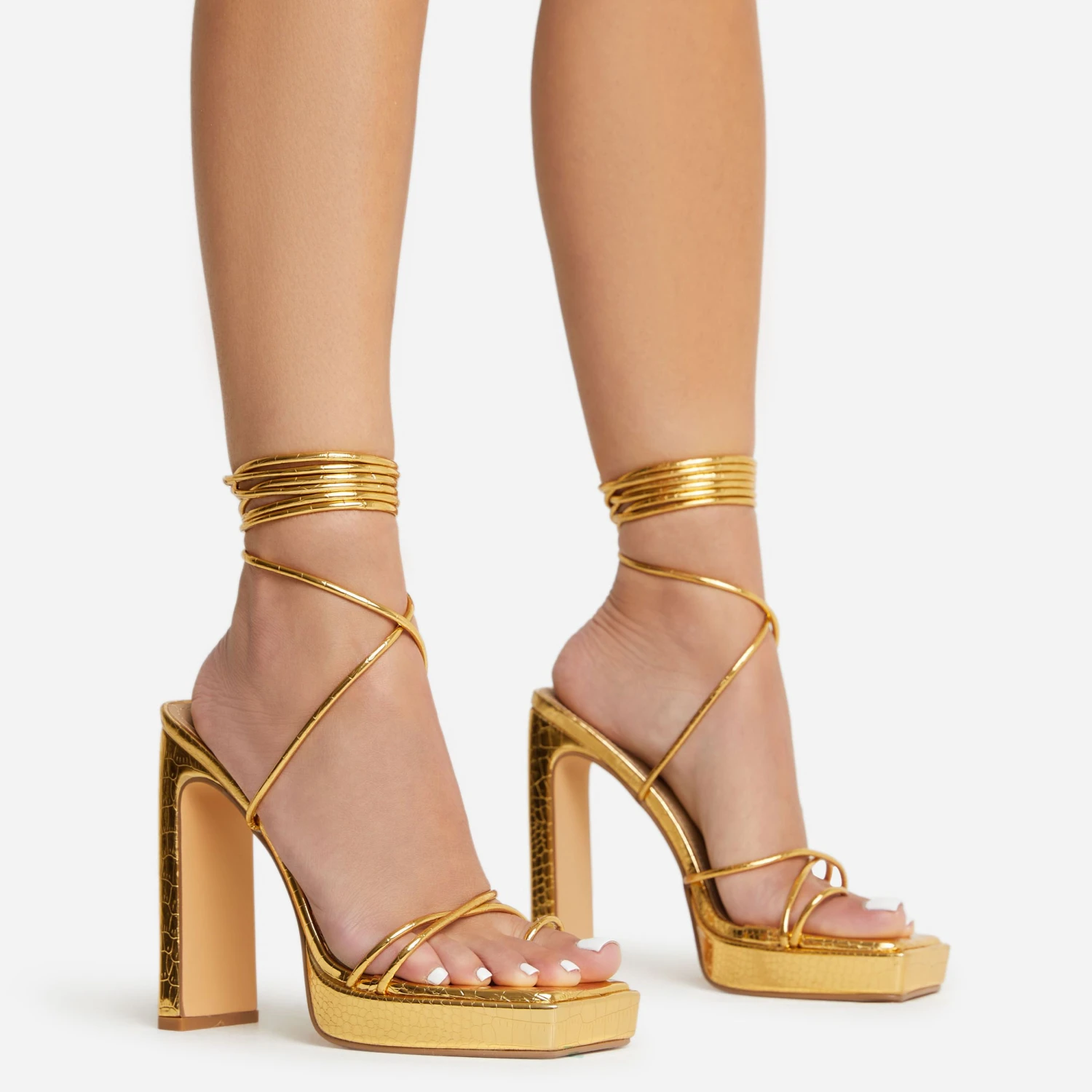 Get yourself noticed in these dreamy heels doll. Featuring a gold croc print faux leather material, with strappy detailing, a platform thin block heel and a lace up finish.