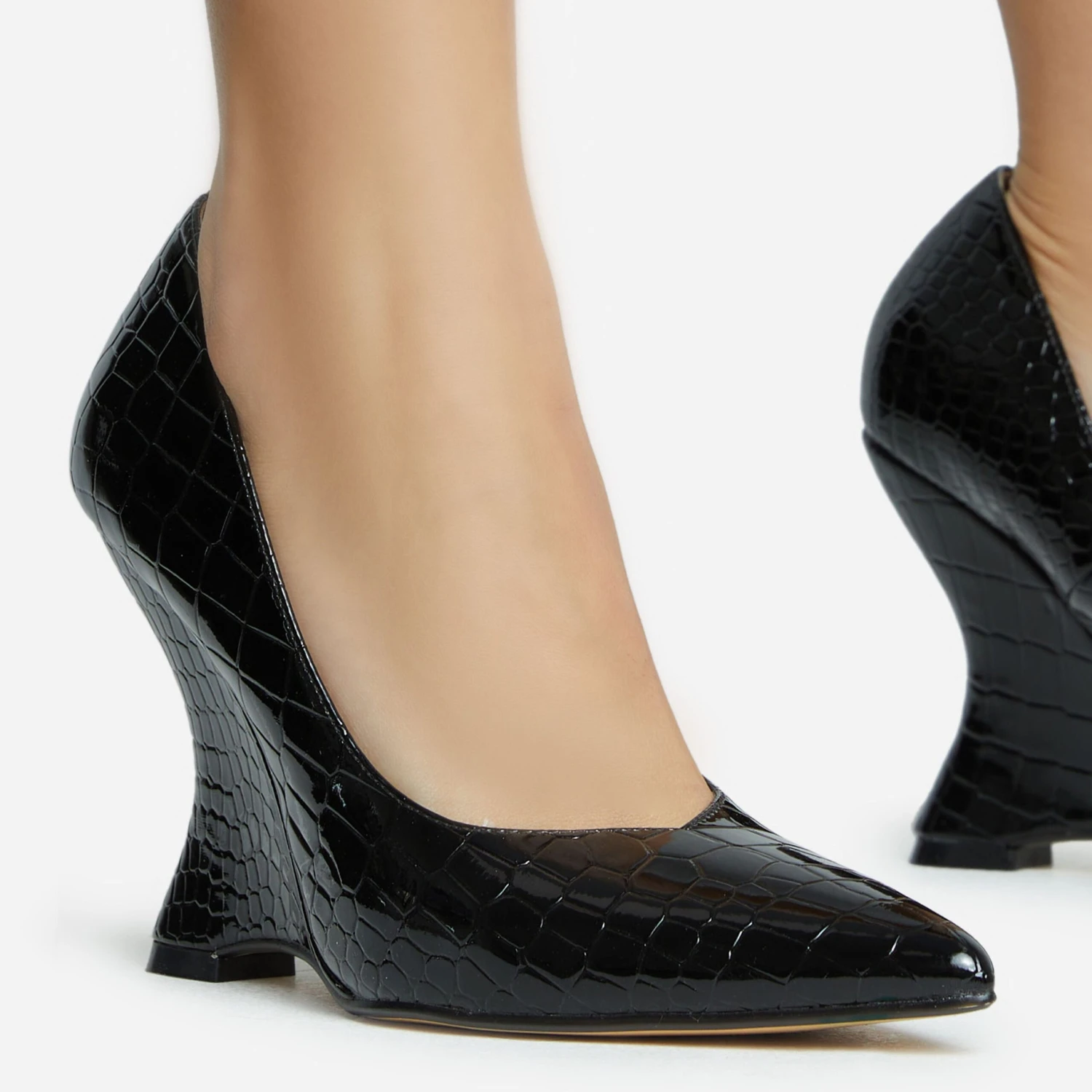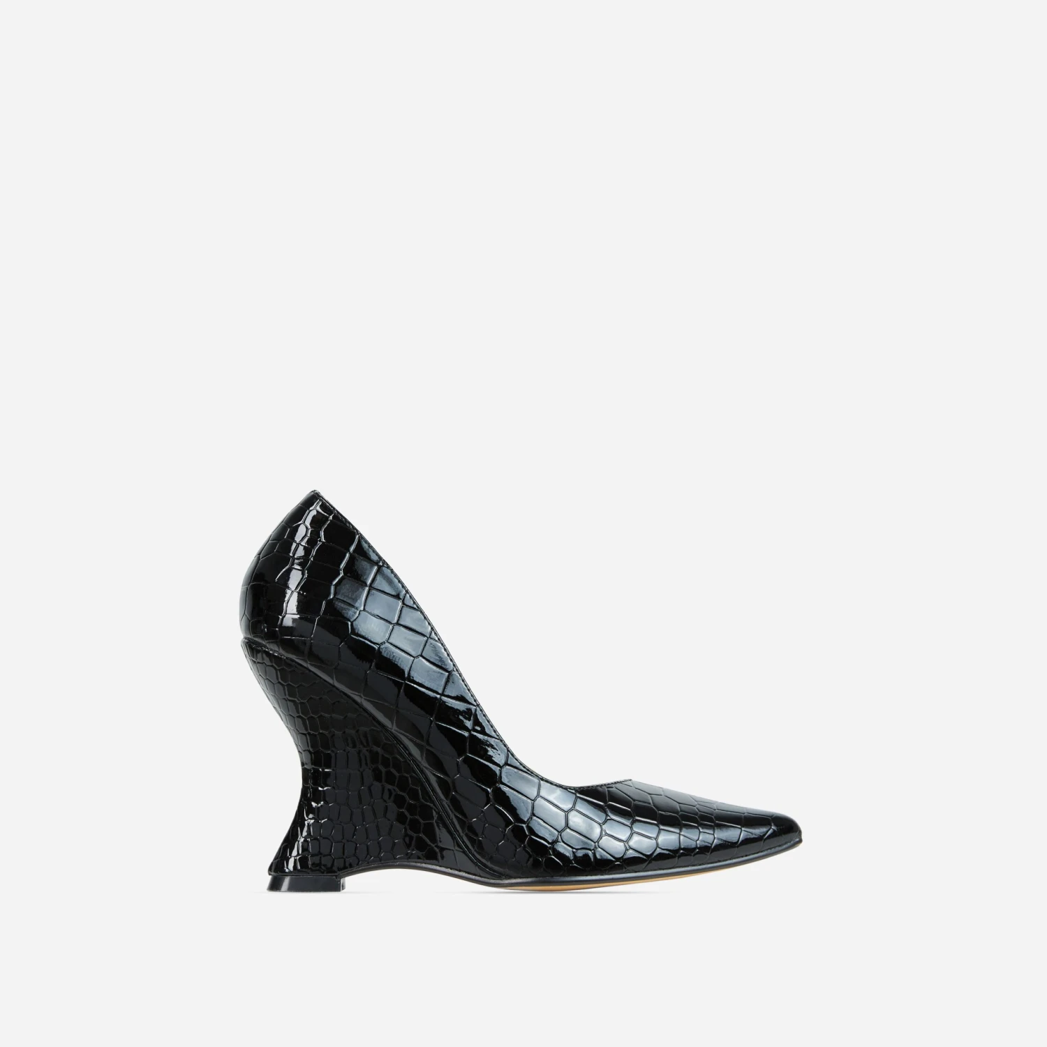 EGO Sugar-Fire Diamante Bow Perspex Strap Square Toe Platform Flared Block Heel In Nude Patent