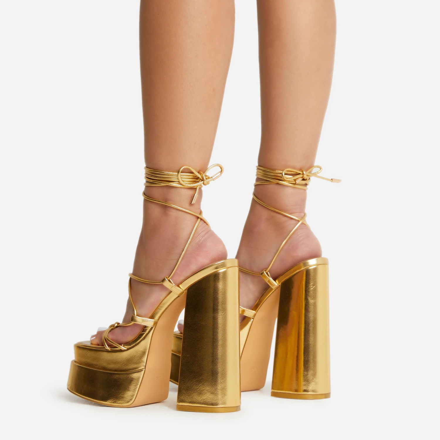 Elevate your evening look with these statement heels doll. Featuring a gold faux leather material, with knotted strap detailing, a platform sole, block heel and a lace up finish.