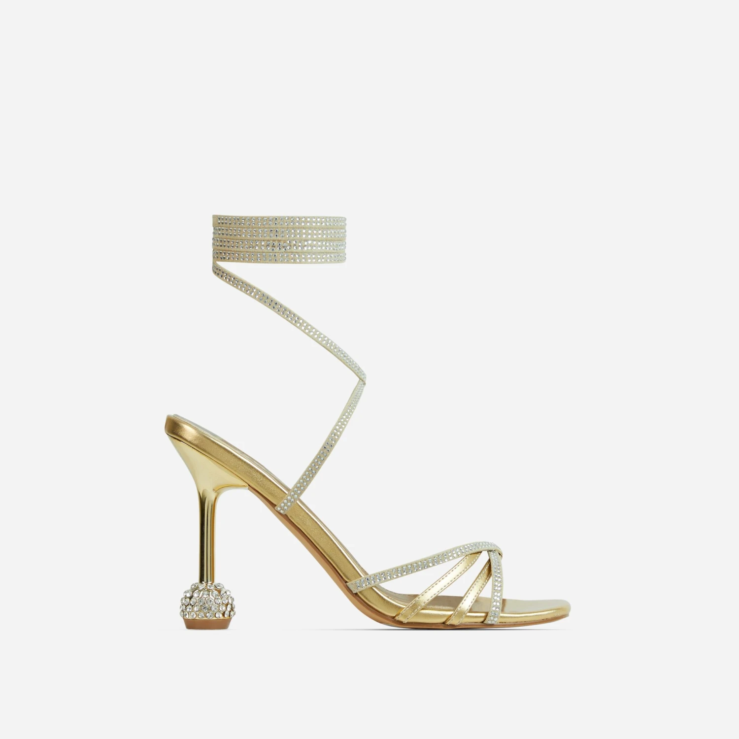 We are obsessing over these heels of dreams. Featuring a gold faux leather material, with diamante detailing, a statement heel and a lace up finish.