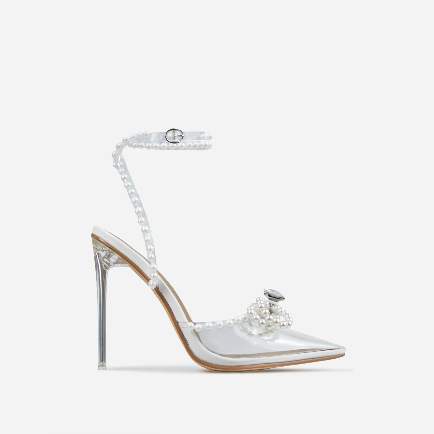 Girl. elevate your going out look. Featuring a white faux leather material, with pearl bow detailing, a perspex pointed toe and a stiletto heel.