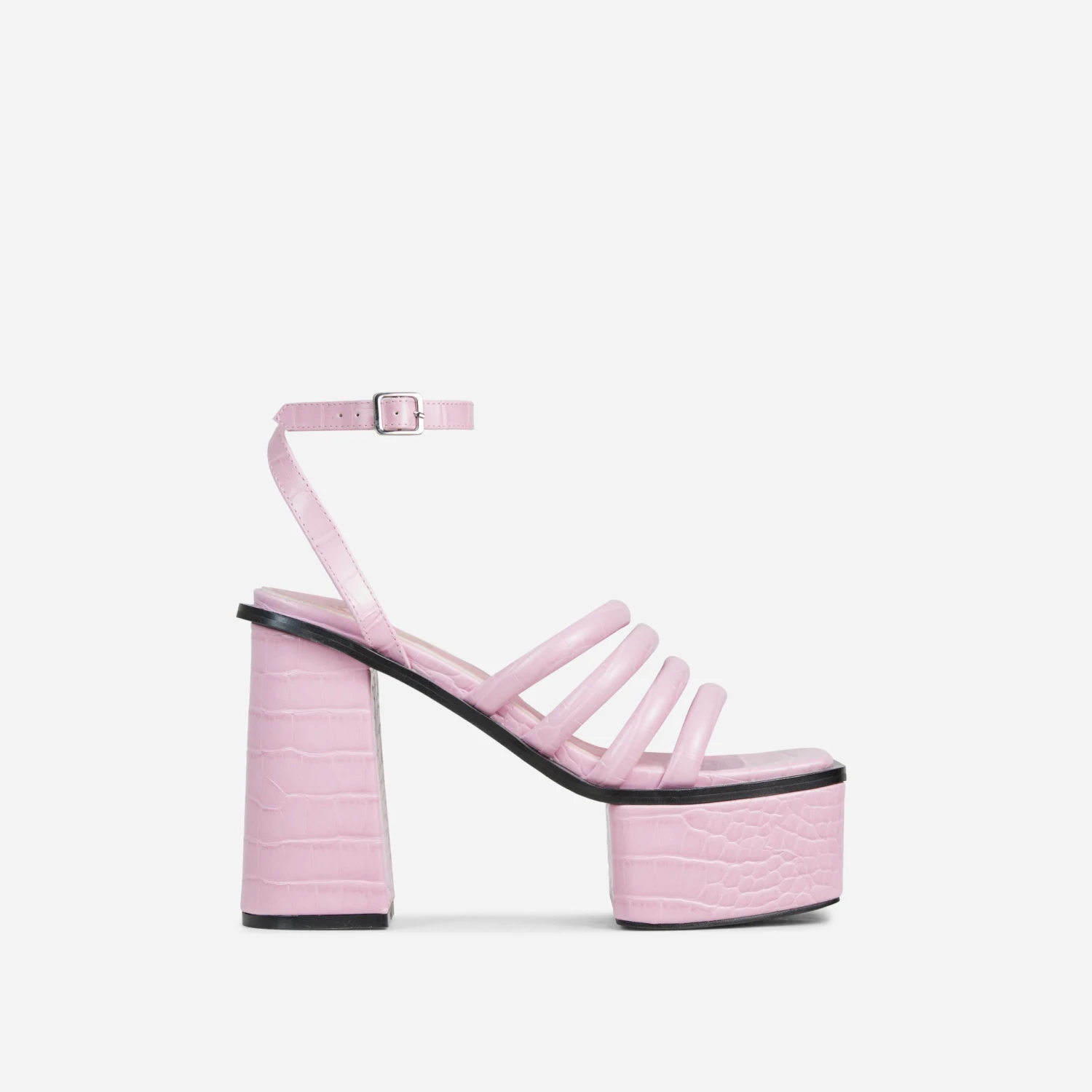 These heels are sure made for walking doll. Featuring a pink faux leather croc print material, a square toe, a platform block heel and a strappy design.