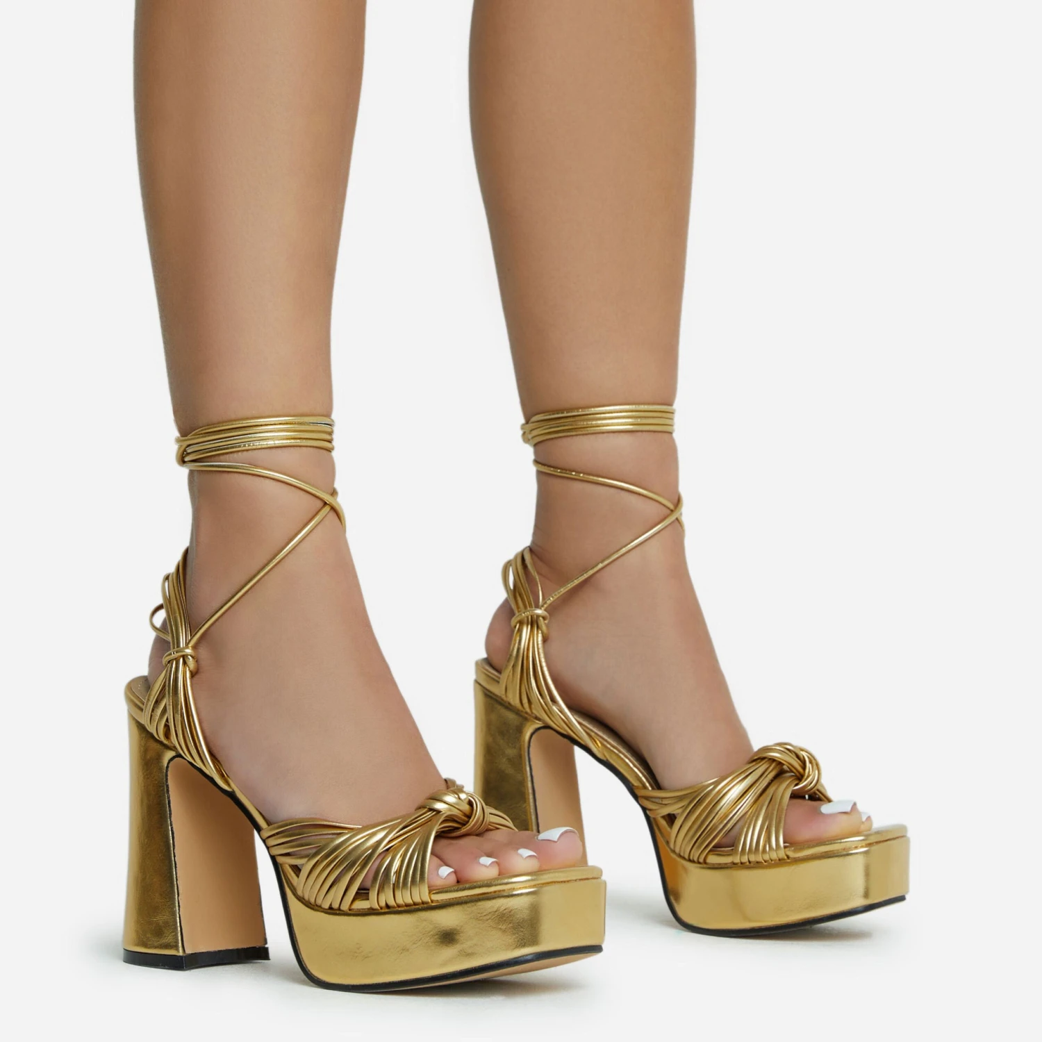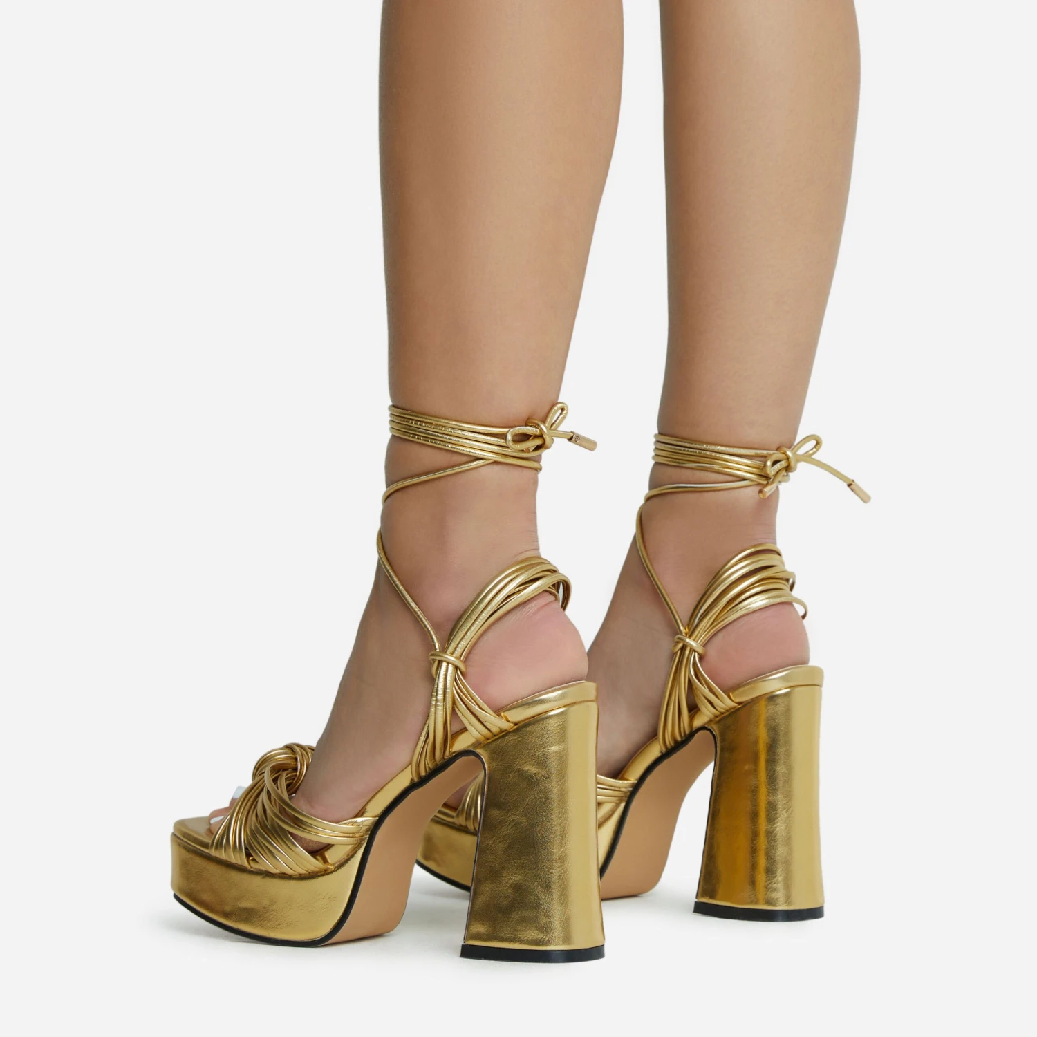 Girl, brand new EGO just landed and we are obsessed. Featuring a gold faux leather material, with knotted strap detailing, a platform sole, block heel and a lace up finish.