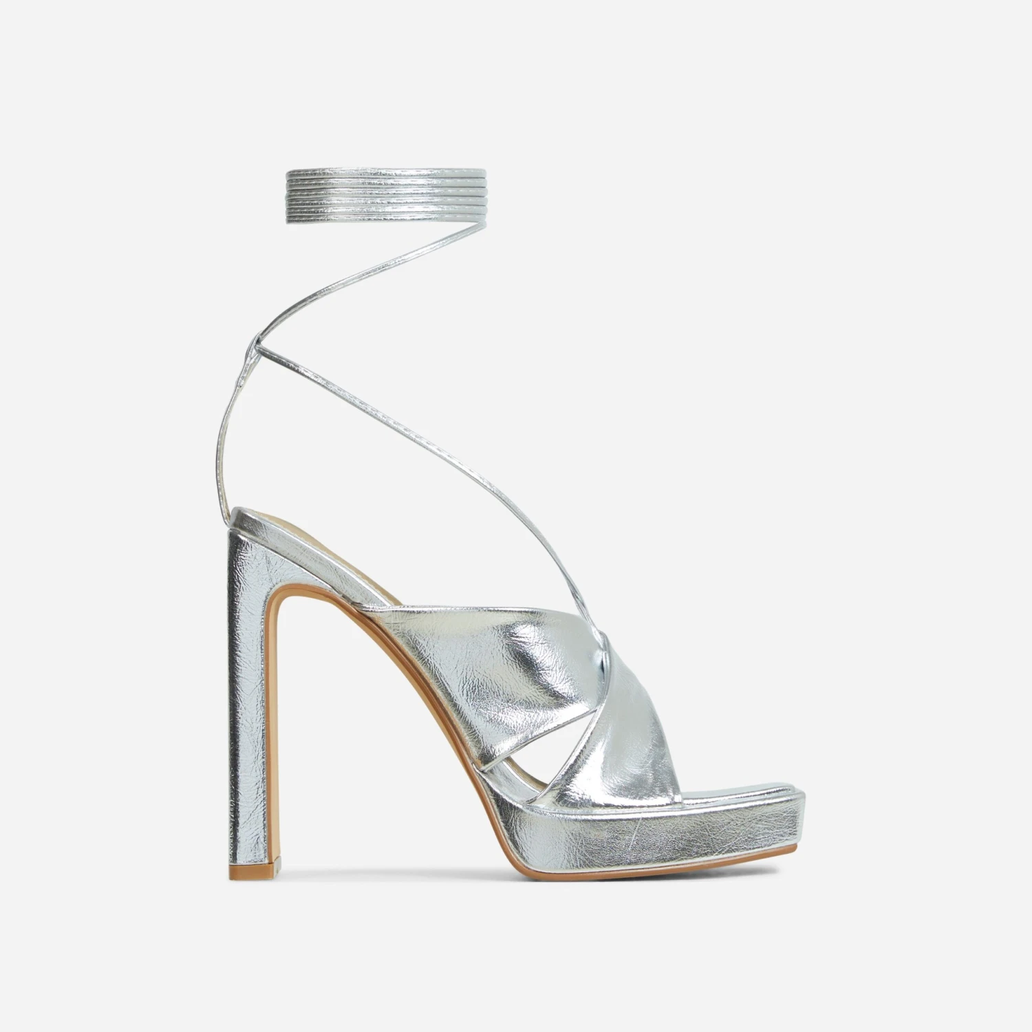 We love these heels for the party season doll. Featuring a silver metallic faux leather material, a lace-up design, a twisted strap and a thin heel.