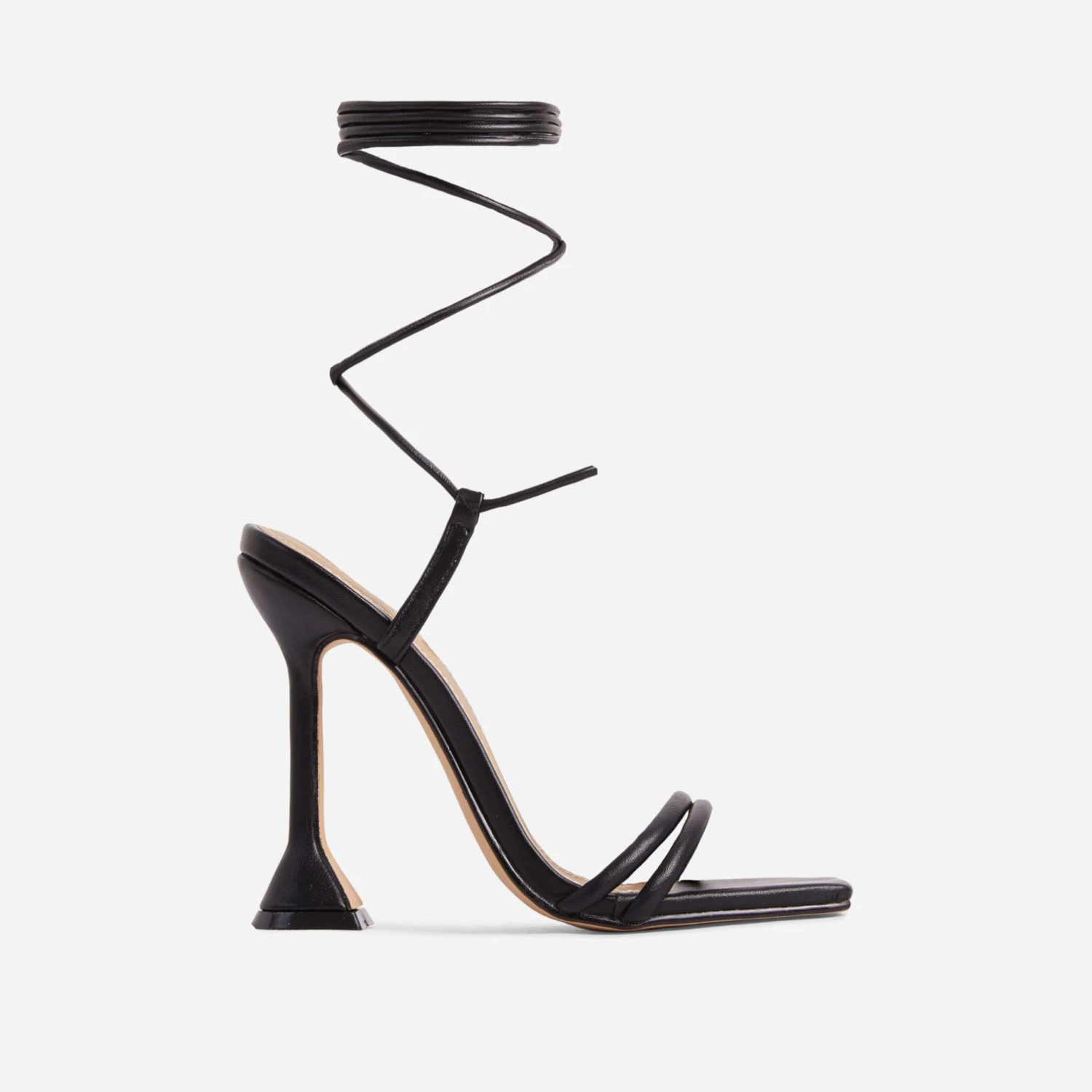 The ultimate must-have heels just dropped. We are obsessed. Featuring a black faux leather material, with double strap detailing, a square toe, sculptured heel and a lace up finish.