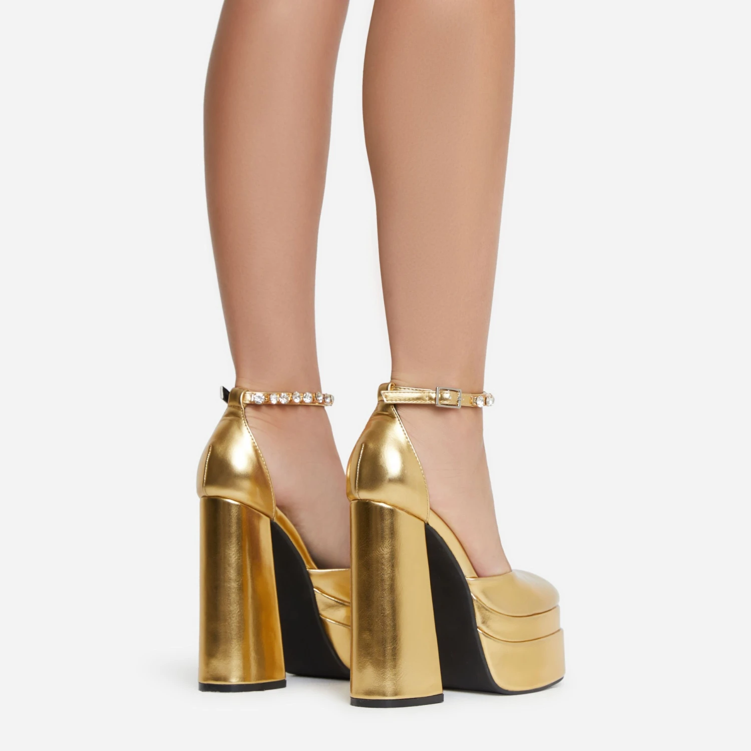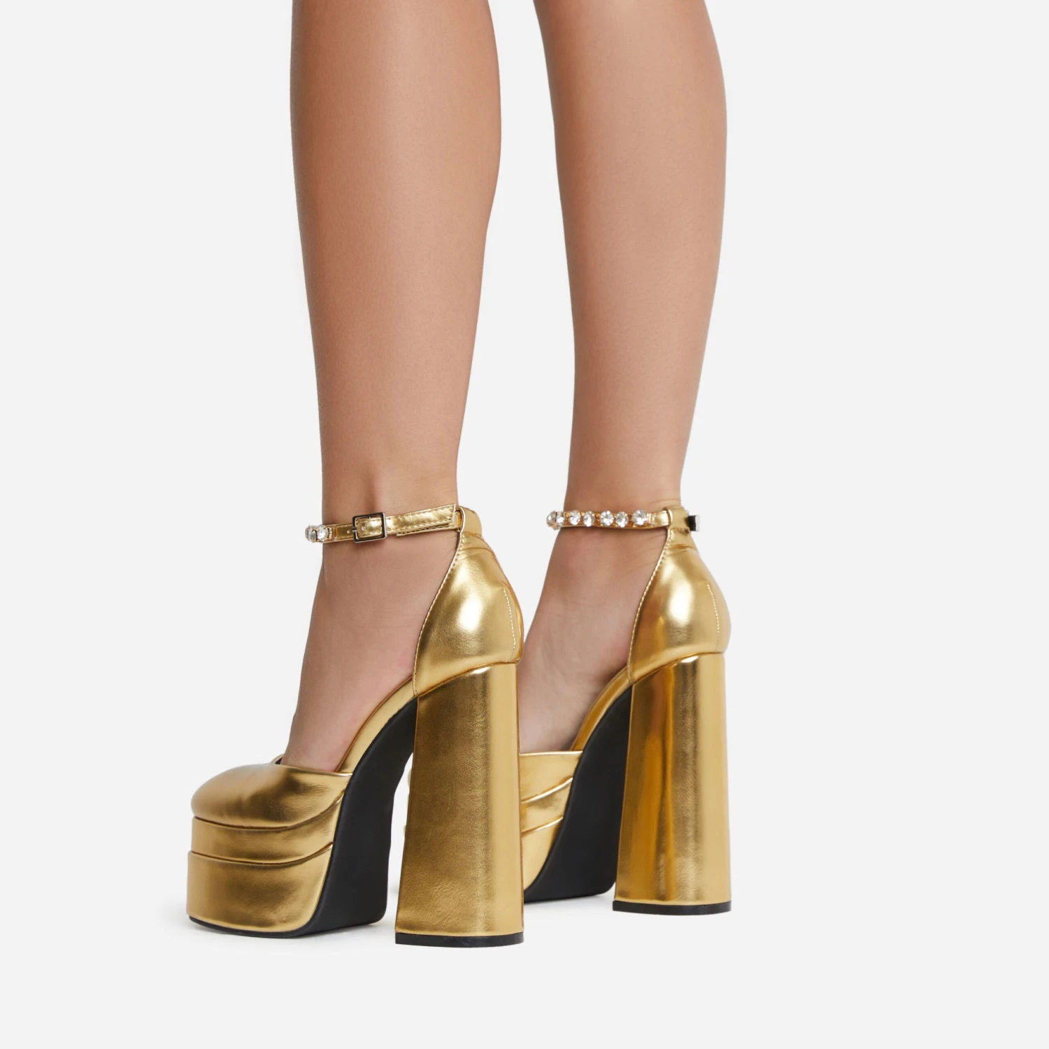 Make a bold entrance in these statement heels doll. Featuring a gold metallic faux leather material, with diamante strap detailing, a closed square toe and an extreme platform block heel.