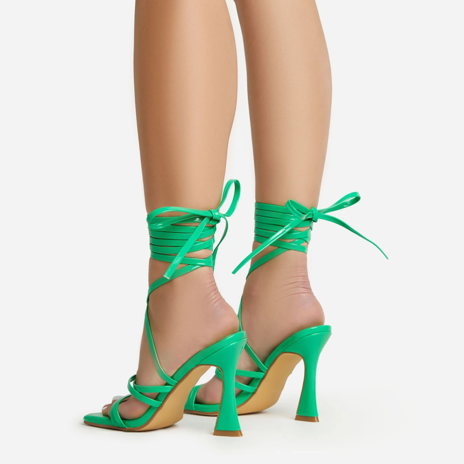 Have all eyes on you with these heels doll. Featuring a green patent material, a flared block heel, a square toe and a strappy design.