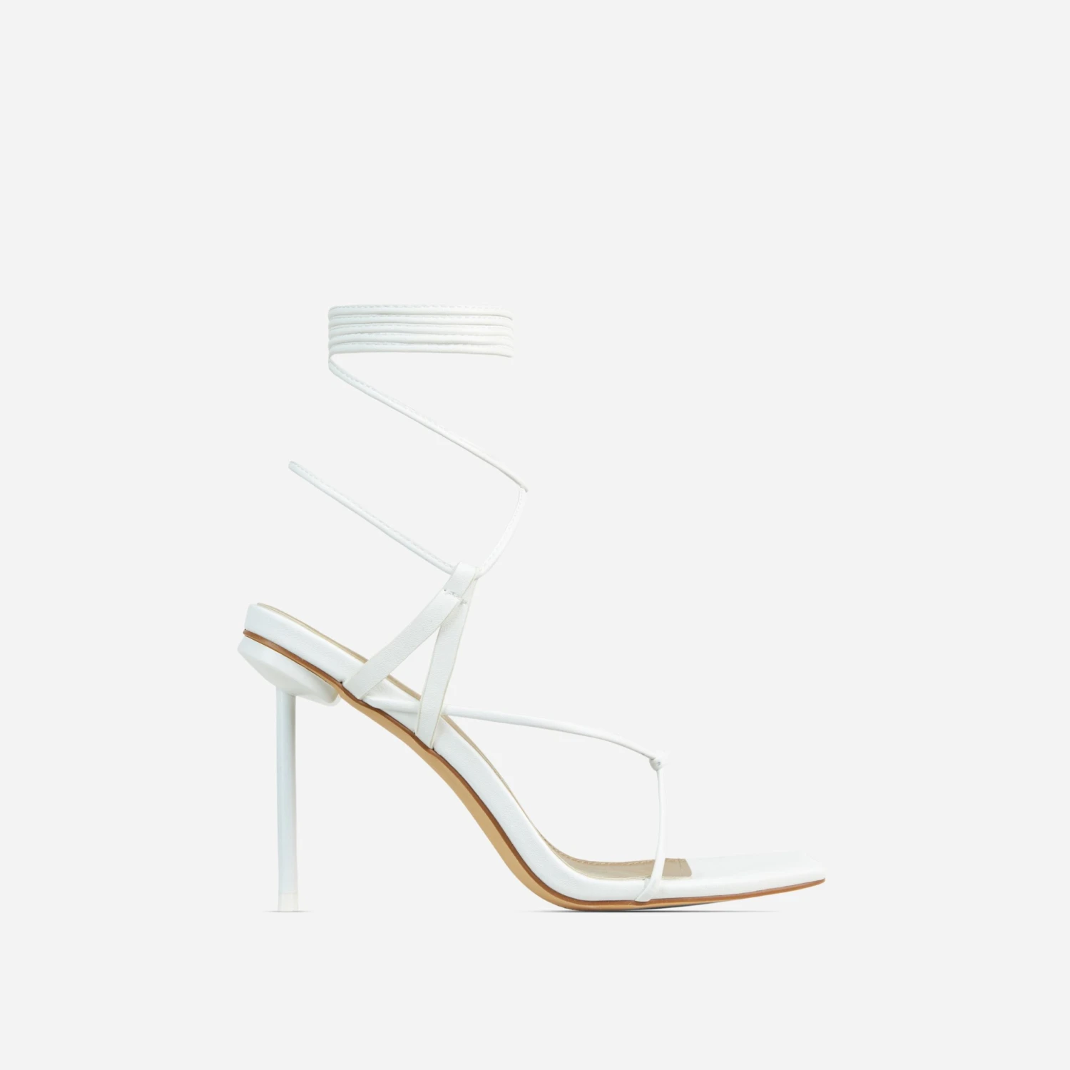 The perfect heels to team with any going out look doll. Featuring a white faux leather material, with knotted strap detailing, a square toe, thin stiletto heel and a lace up finish.