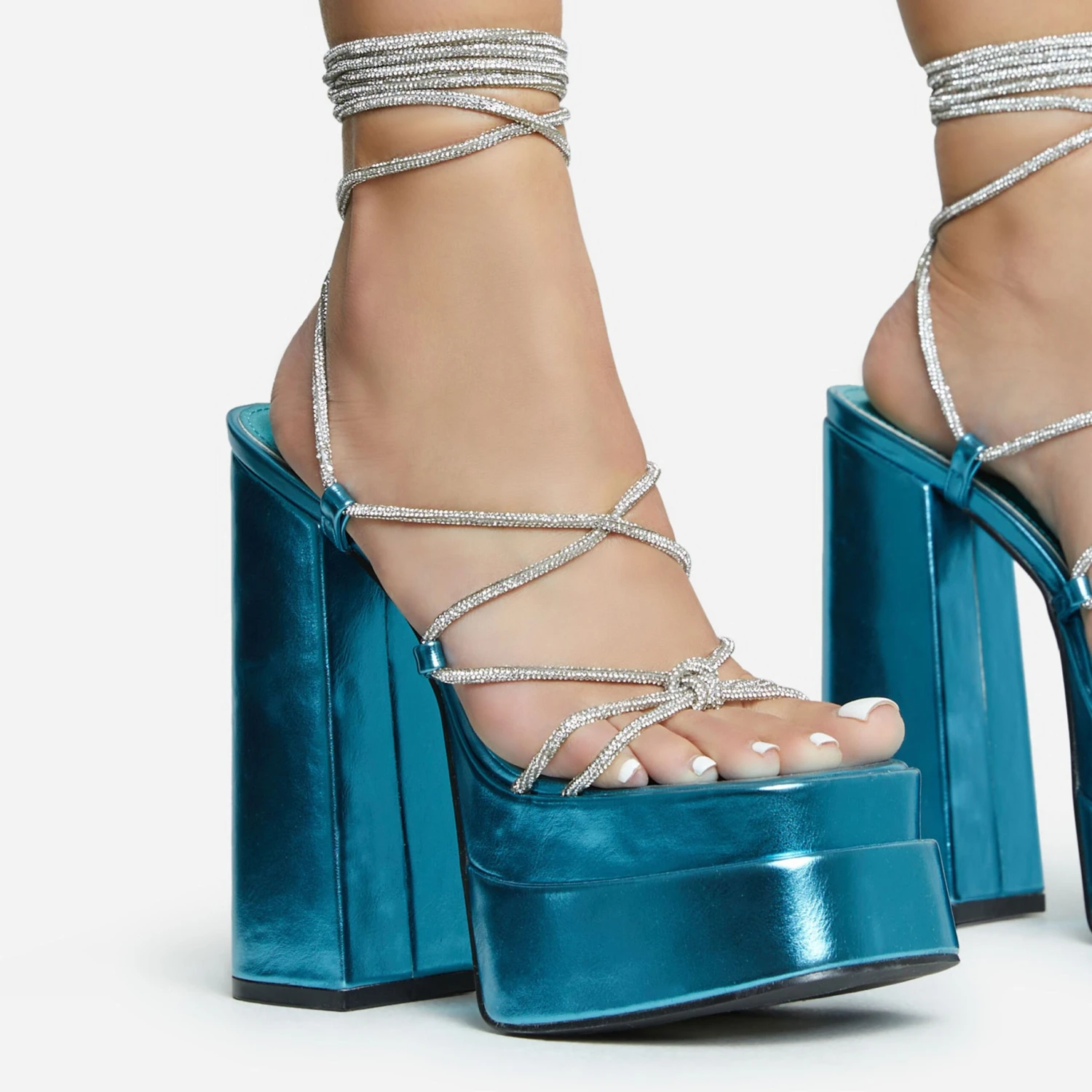 Hit refresh on your shoedrobe with these must have heels doll. Featuring a blue metallic faux leather material, a lace-up design, diamante detailing and an extreme platform heel.