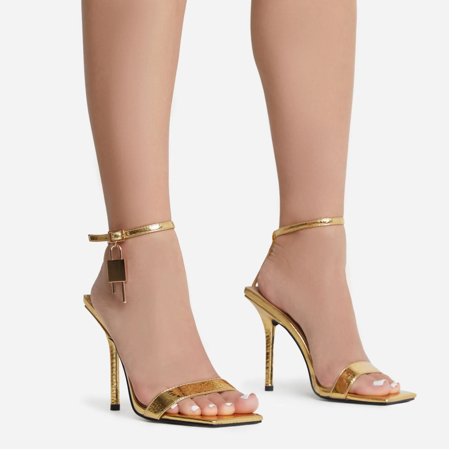 These heels were made to be seen in. Featuring a gold croc print faux leather material, with padlock detailing, a square toe and a stiletto heel.