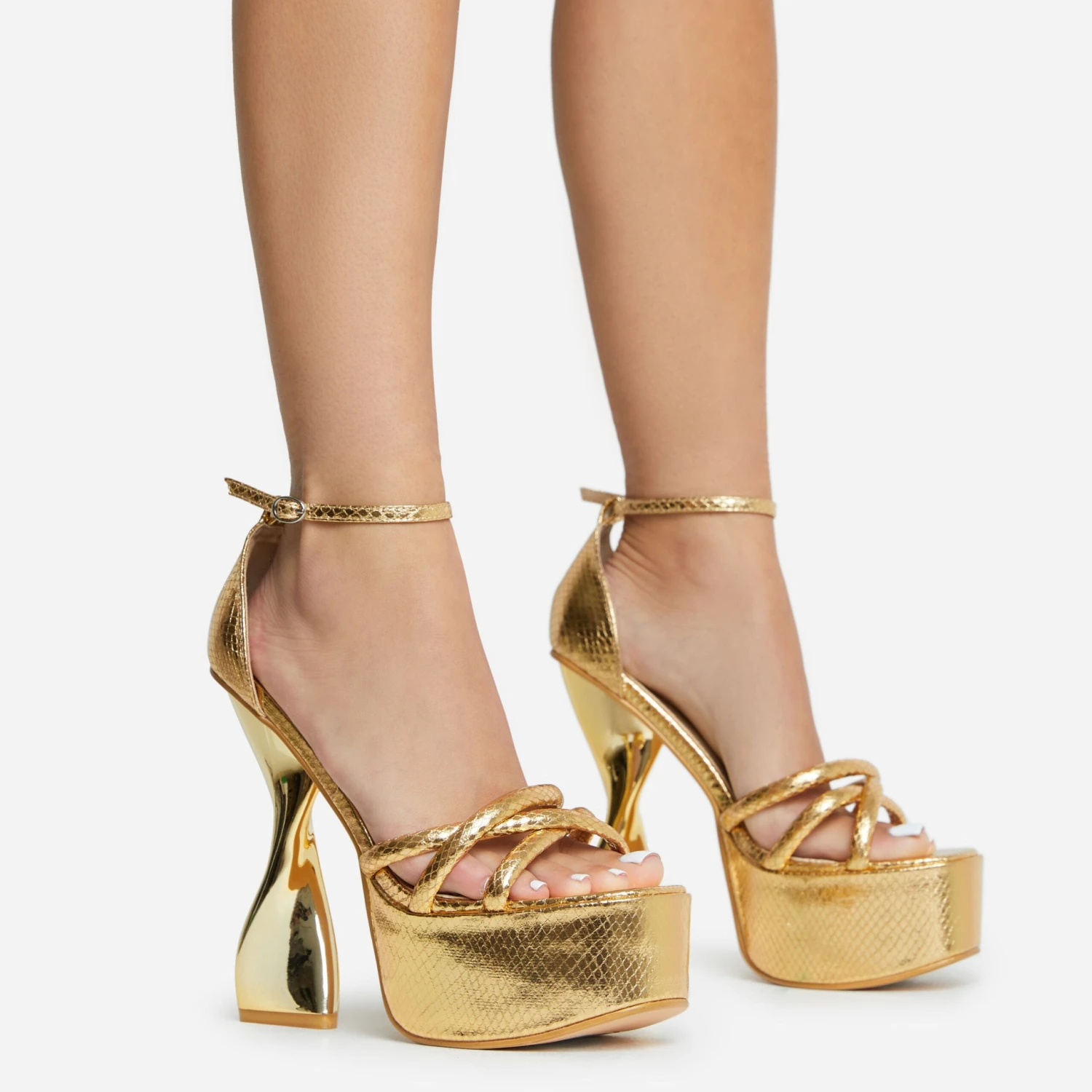 Make a bold entrance with these statement party heels doll. Featuring a gold croc print faux leather material, with strappy detailing, a platform sole and a twisted heel.