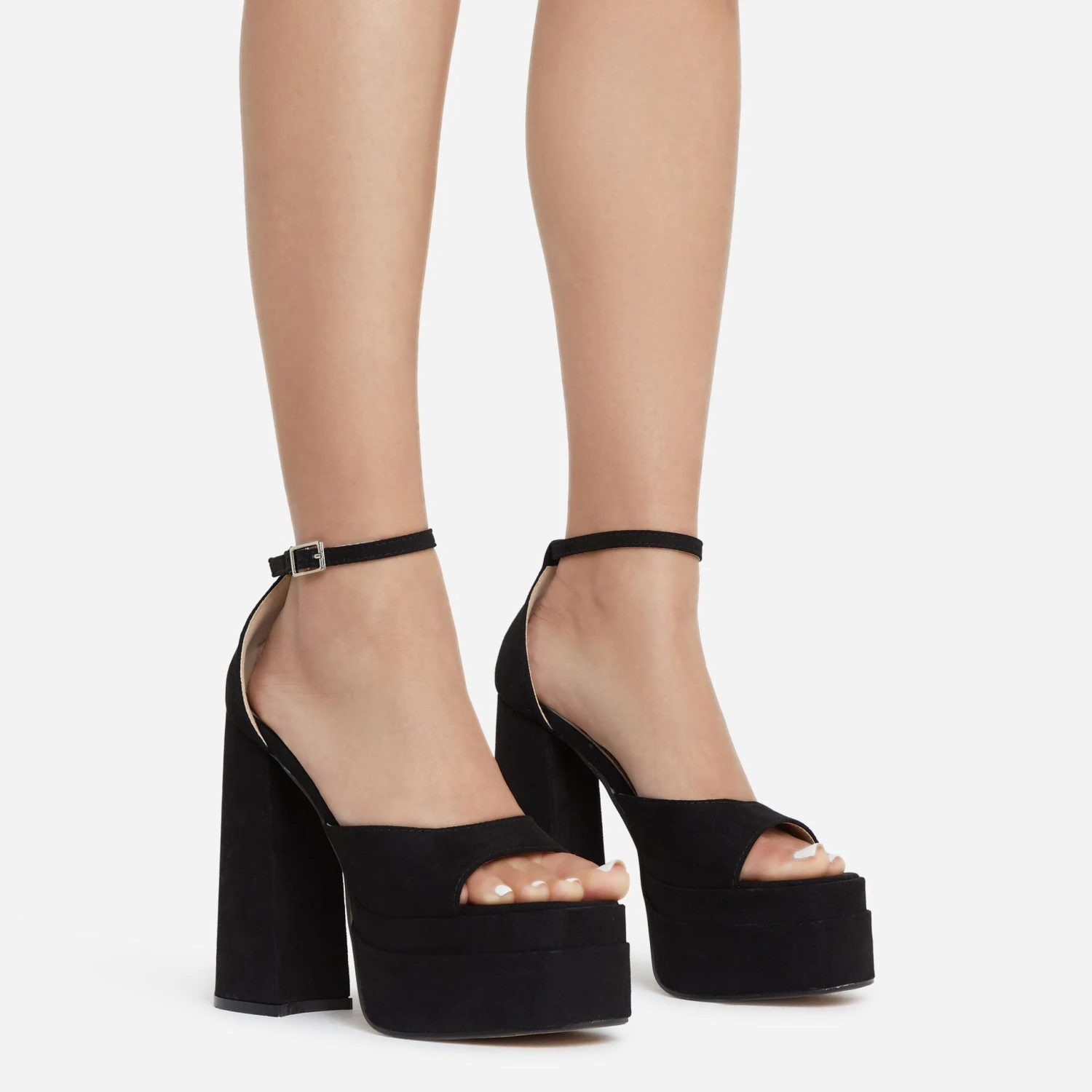 Girl, go extra always. Featuring a black satin material, with a double platform sole, a peep toe and a block heel.