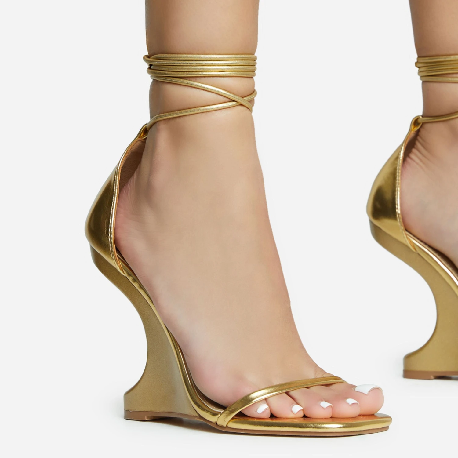 Elevate your evening look with these statement heels. Featuring a gold faux leather material, with a cut out wedge heel, a square toe and a lace up finish.