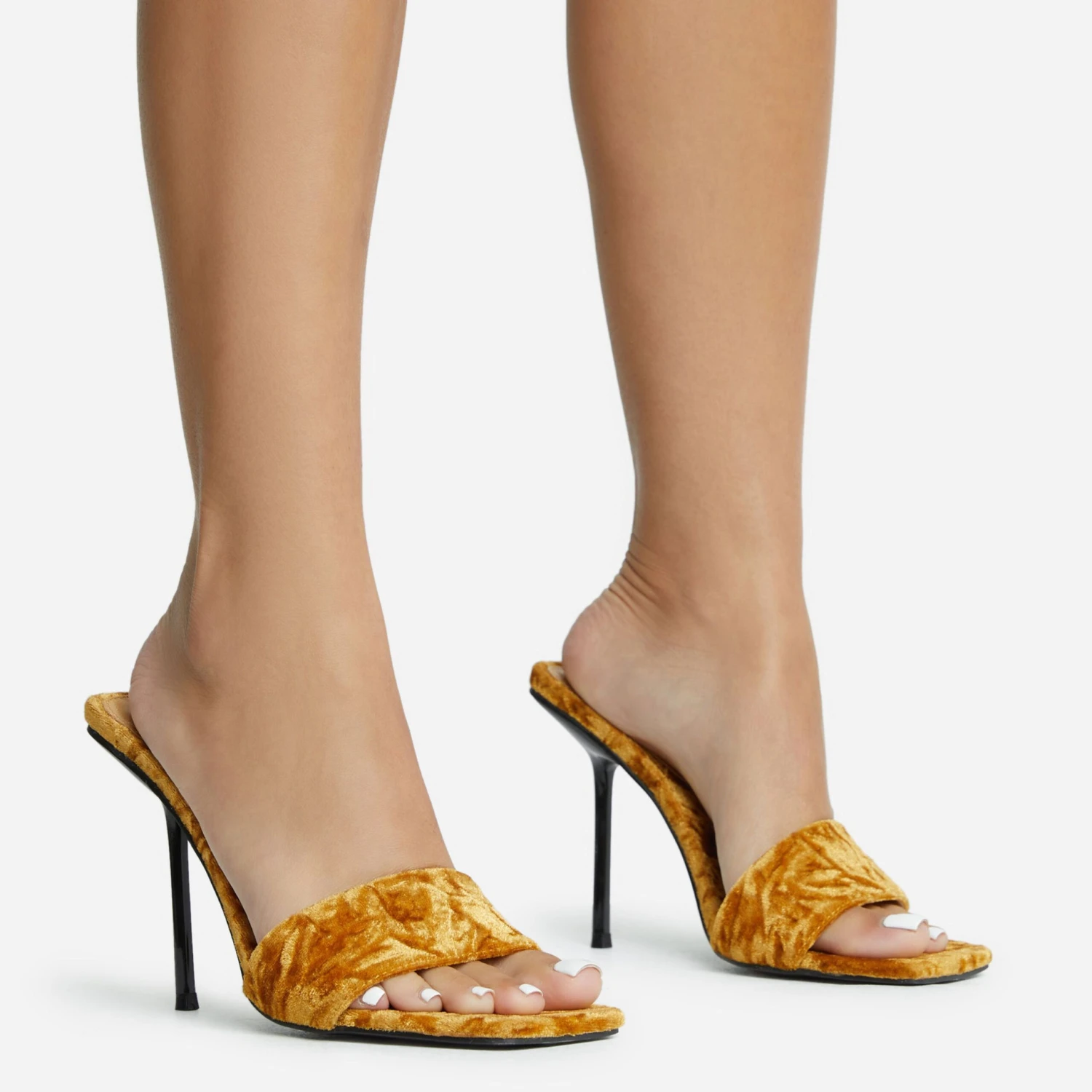 Take your look to new levels with these mules doll. Featuring a mustard velvet material, an open square toe, a stiletto heel and a mule design.