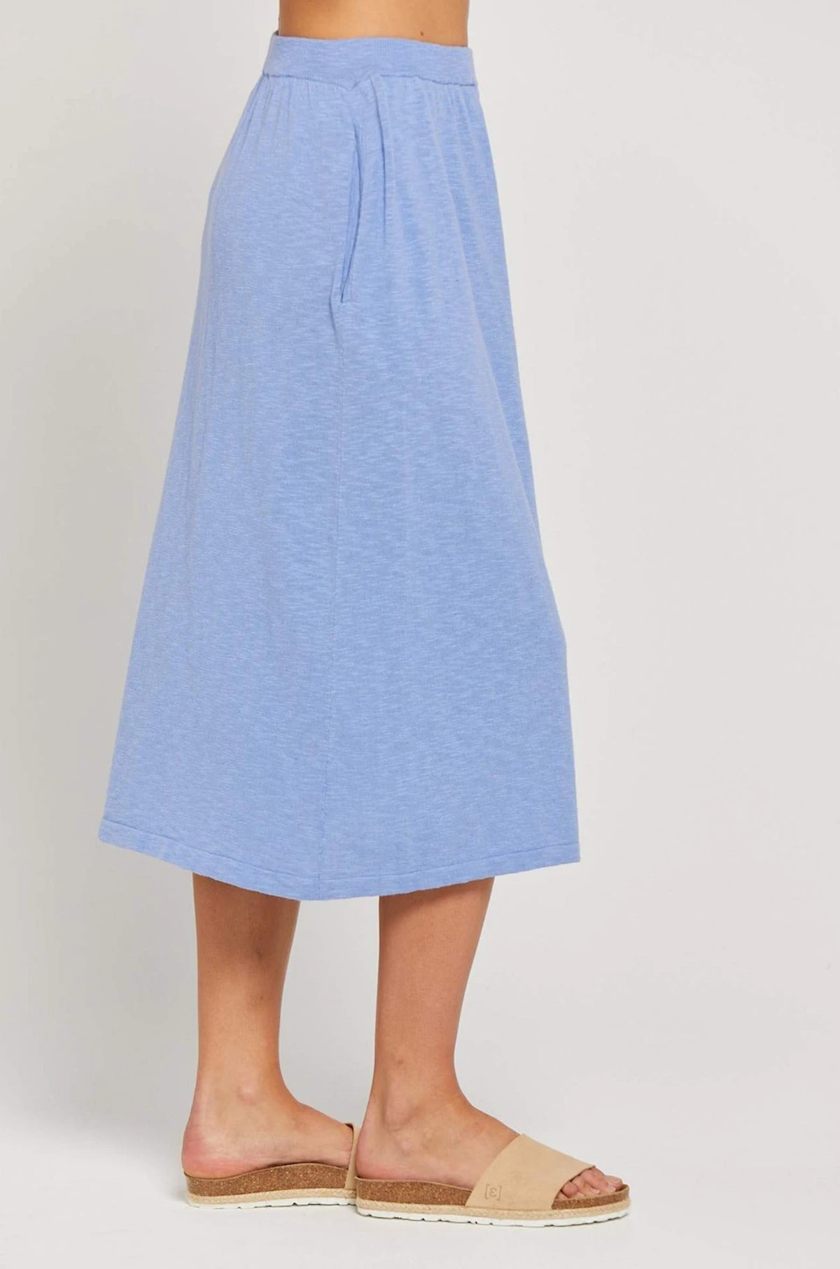 The Giovanna Skirt is knitted from a lightweight Cotton, Linen blend. This midi length skirt will be a go-to style in your wadrobe for many years to come. Featuring side seam pockets and an elastic waist band this skirt is sure to be a staple. Pair this back with the Bridget Top.