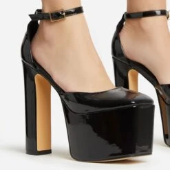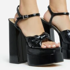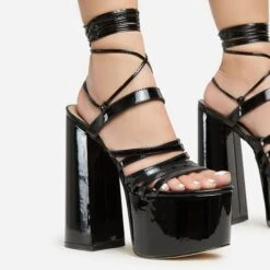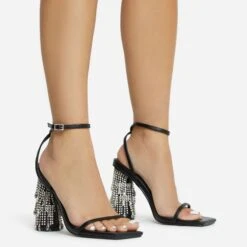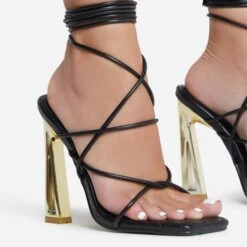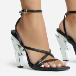 EGO Cadence Strappy Square Toe Metallic Lighting Bolt Statement Heel In Black Faux Leather