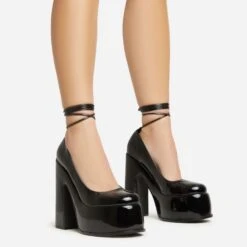 EGO Roseville Lace Up Quilted Insole Square Toe Cut Out Flared Heel In Black Faux Leather