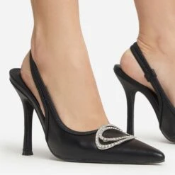 EGO Interlocking Diamante Detail Pointed Toe Slingback Court Heel In Silver Faux Leather