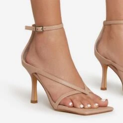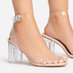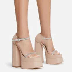 EGO Peggie Diamante Strap Open Square Toe Extreme Platform Block Heel In Nude Faux Leather