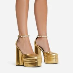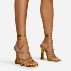 EGO Waves Lace Up Strappy Square Toe Flared Block Heel In Gold Croc Print Faux Leather