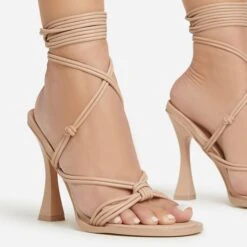 EGO Flamingo Lace Up Faux Feather Detail Square Toe Metallic Thin Block Heel In Nude Faux Leather