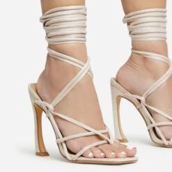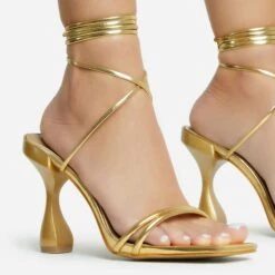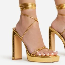 EGO Gemini Strappy Lace Up Square Toe Platform Thin Block Heel In Gold Croc Print Faux Leather