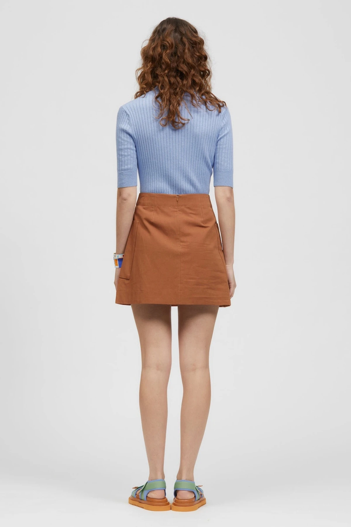 The Jozani Mini Skirt is a high waist, mini skirt with large patch pockets wrapping from the front to the side body. This style has an invisible back zip opening and back darts for a flattering fit. Made from a structured Cotton fabrication.