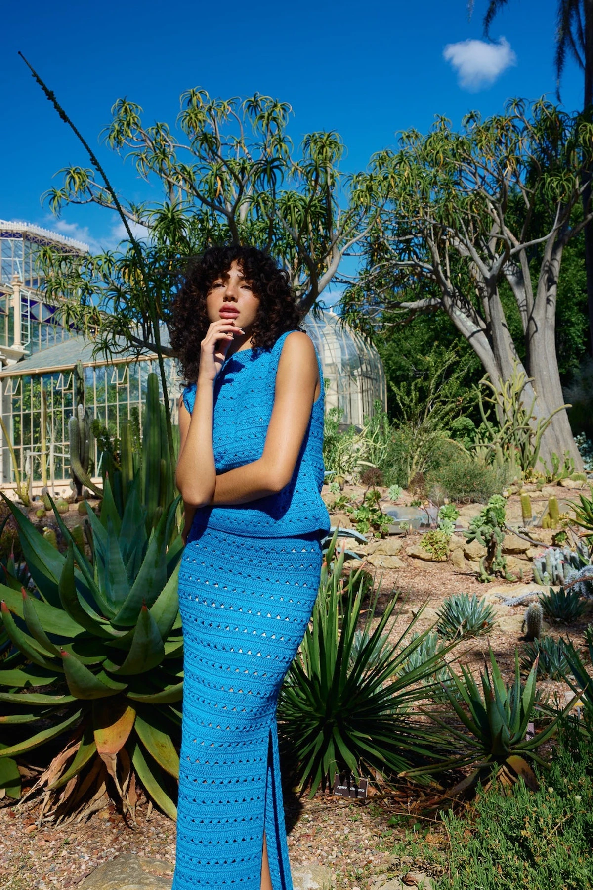 The Laura Skirt in Blue is a straight skirt crafted from a hand crocheted airy 100% cotton yarn. The skirt features a classic straight silhouette with added side vents, an elasticated waistband and a detachable modest slip. Perfect for layering over swimwear or style with the matching Laura Crochet Top for elevated co-ord dressing to take you from day to night.