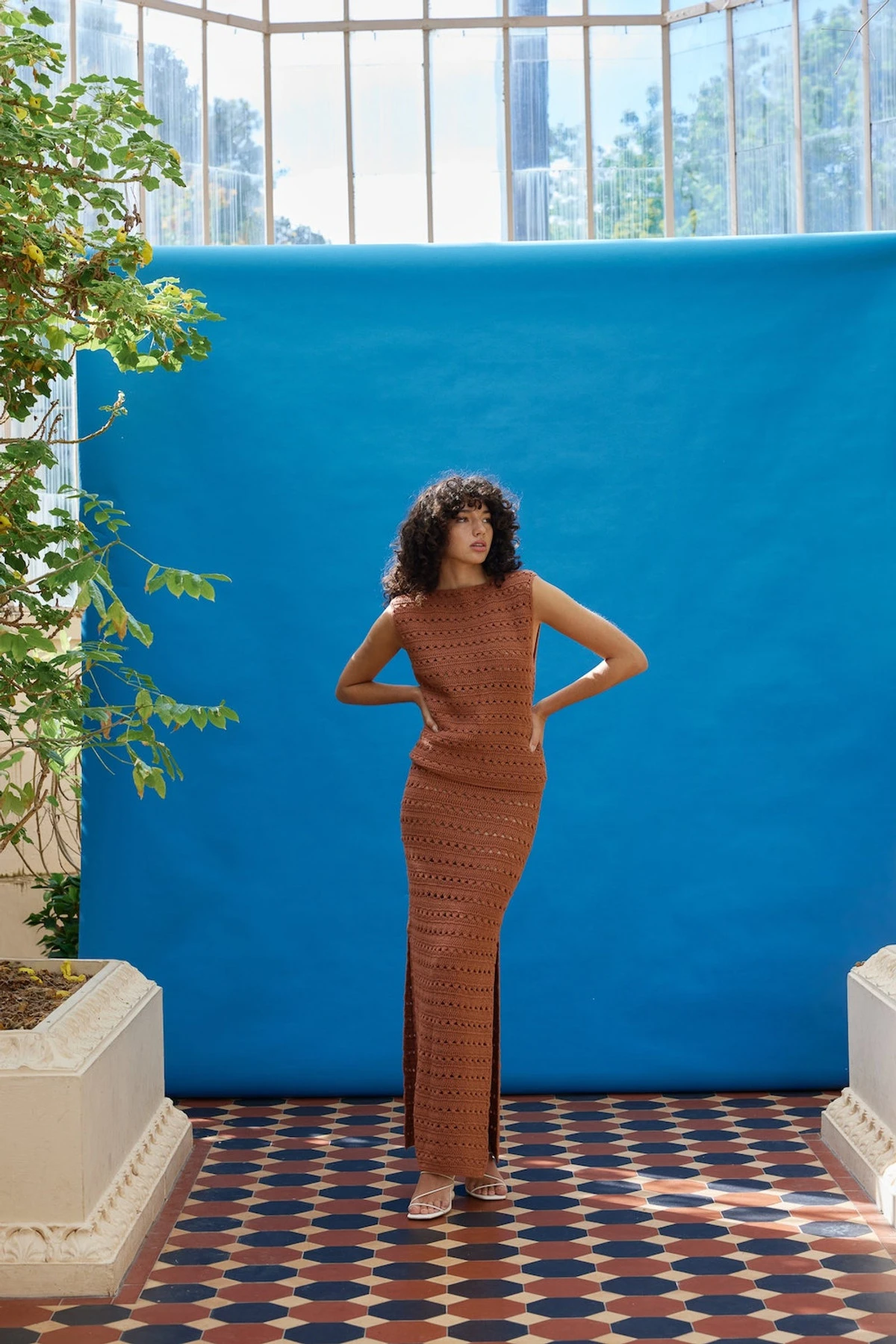 The Laura Skirt in Rust is a straight skirt crafted from a hand crocheted airy 100% cotton yarn. The skirt features a classic straight silhouette with added side vents, an elasticated waistband and a detachable modest slip. Perfect for layering over swimwear or style with the matching Laura Crochet Top for elevated co-ord dressing to take you from day to night.