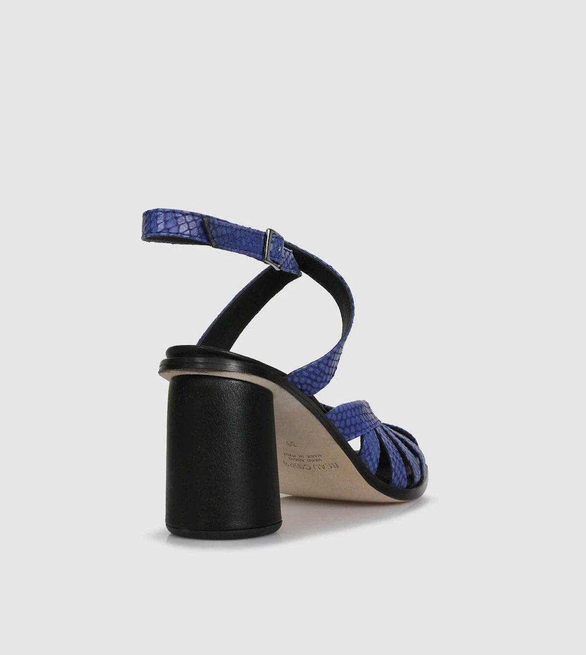 The Mara Block Sandals by Beau Coops, boast a one-of-a-kind, cage-style upper with a wrap-around ankle strap. Boasting printed snake leather and a rounded block heel, they create a bold fashion statement. Show off your trendy style with these Italian-crafted sandals, made with premium materials.