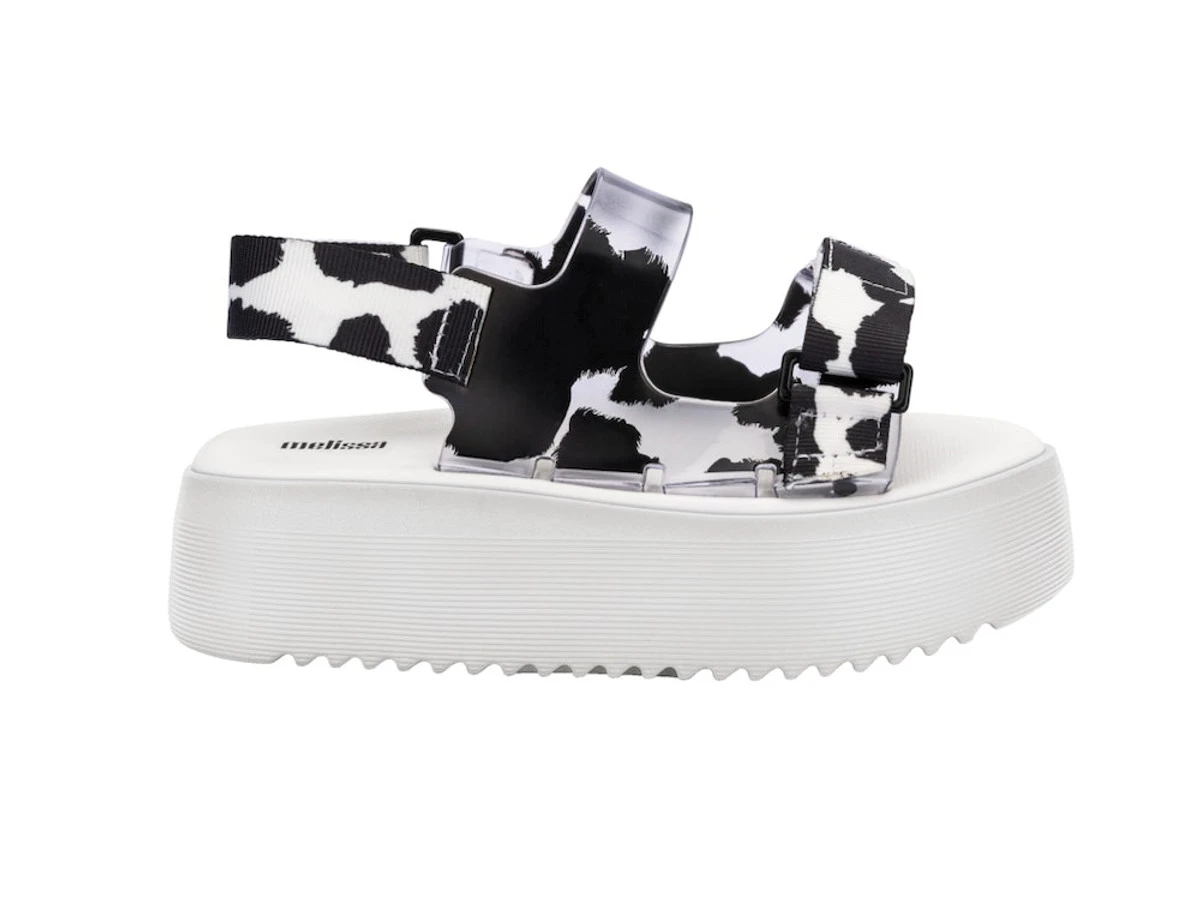 For those who love to live the high life, the Melissa Brave Platform offers a new level of fashion fun. It is a high-heeled sandal with an ultra-thick ridged platform sole. Its upper is formed by two medium-sized straps with velcro closures and has another fabric strap that wraps the heel and also has velcro closure.Â
