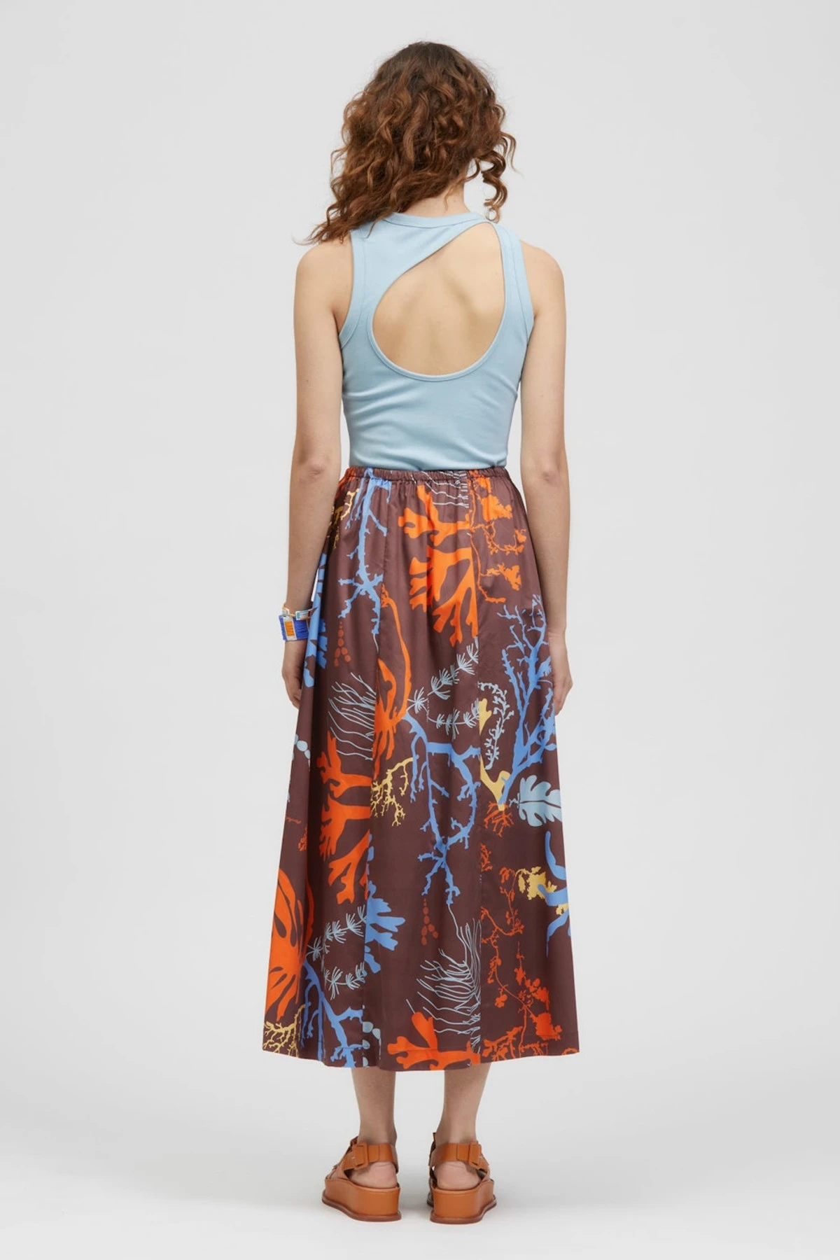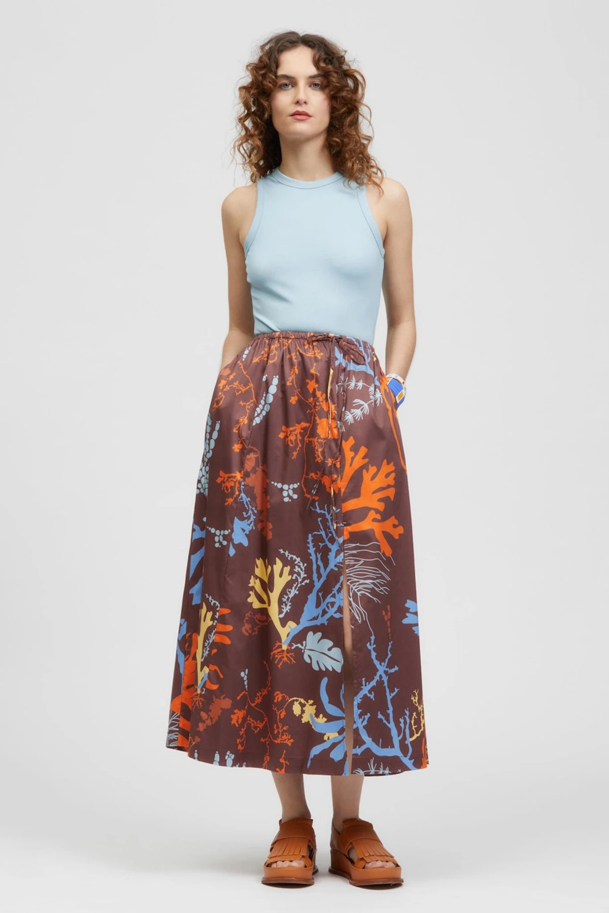 The Roho Maxi Skirt is a high-waisted, maxi skirt with a front side slit. This style includes a waistband with internal elastic which creates soft gathers and volume in the skirt and a drawstring feature at the waistband that can be tied at the side front. This style offers panel detailing and is made from a structured Cotton/Tencel blend featuring búl’s house-designed Brown Seaweed Print. This style can be paired back with your existing wardrobe favourites or with the Pembar Top in matching fabric as a set.