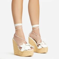 EGO Beggin Lace Up Diamante Strap Detail Square Toe Wedge Heel In Silver Faux Leather