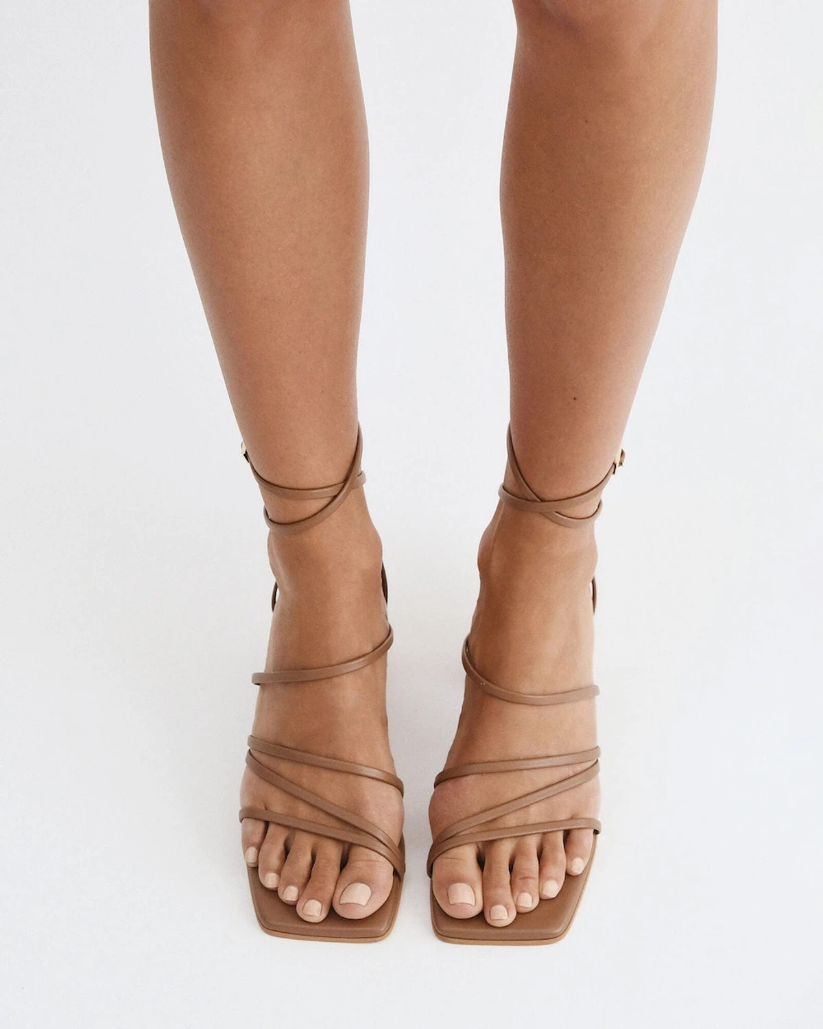 Update your heel selection with SOFIA. The lace- up leather ties elegantly around the ankle and is adjustable with an adjustable metal buckle. Stacked on a leather wrapped block heel, SOFIA is ready for your outfits all event season long.