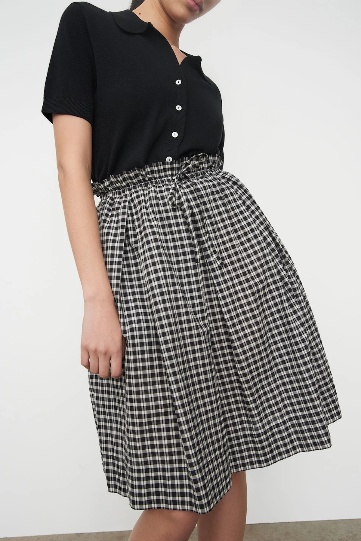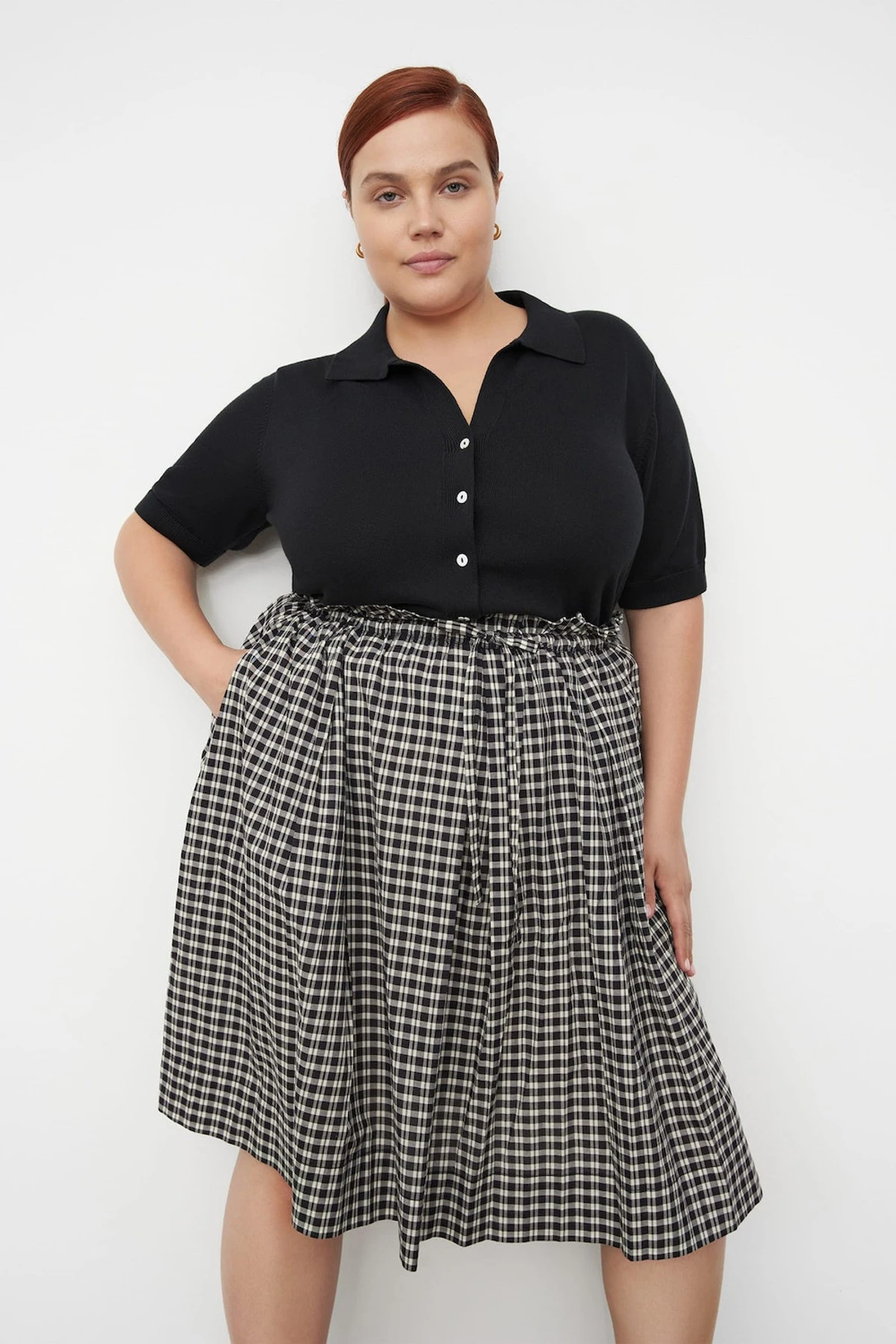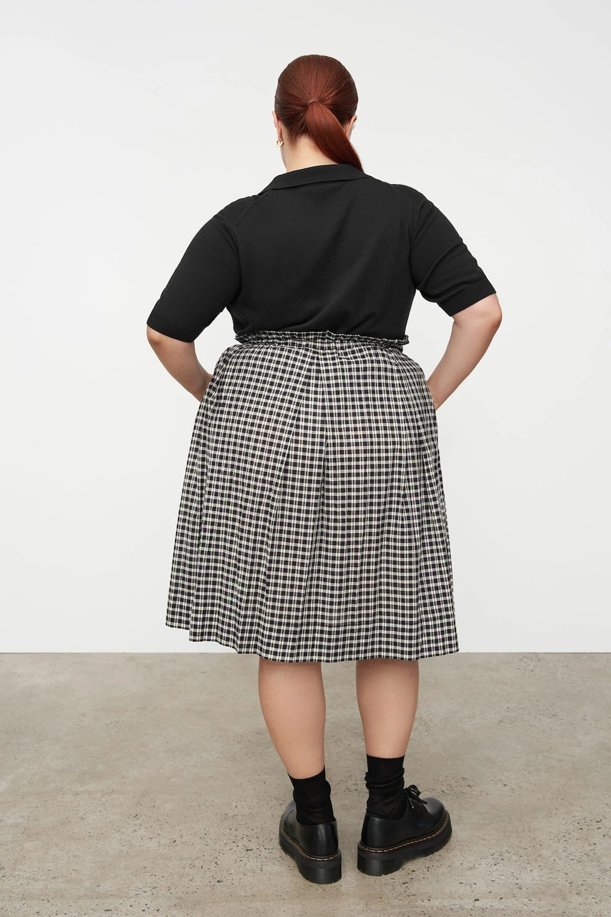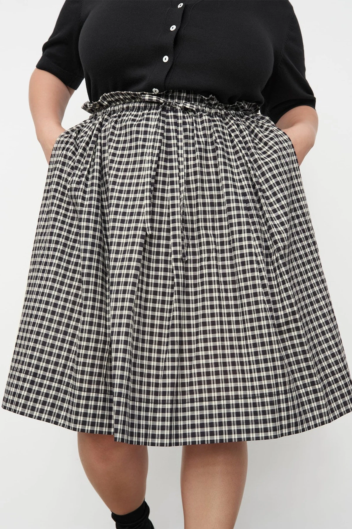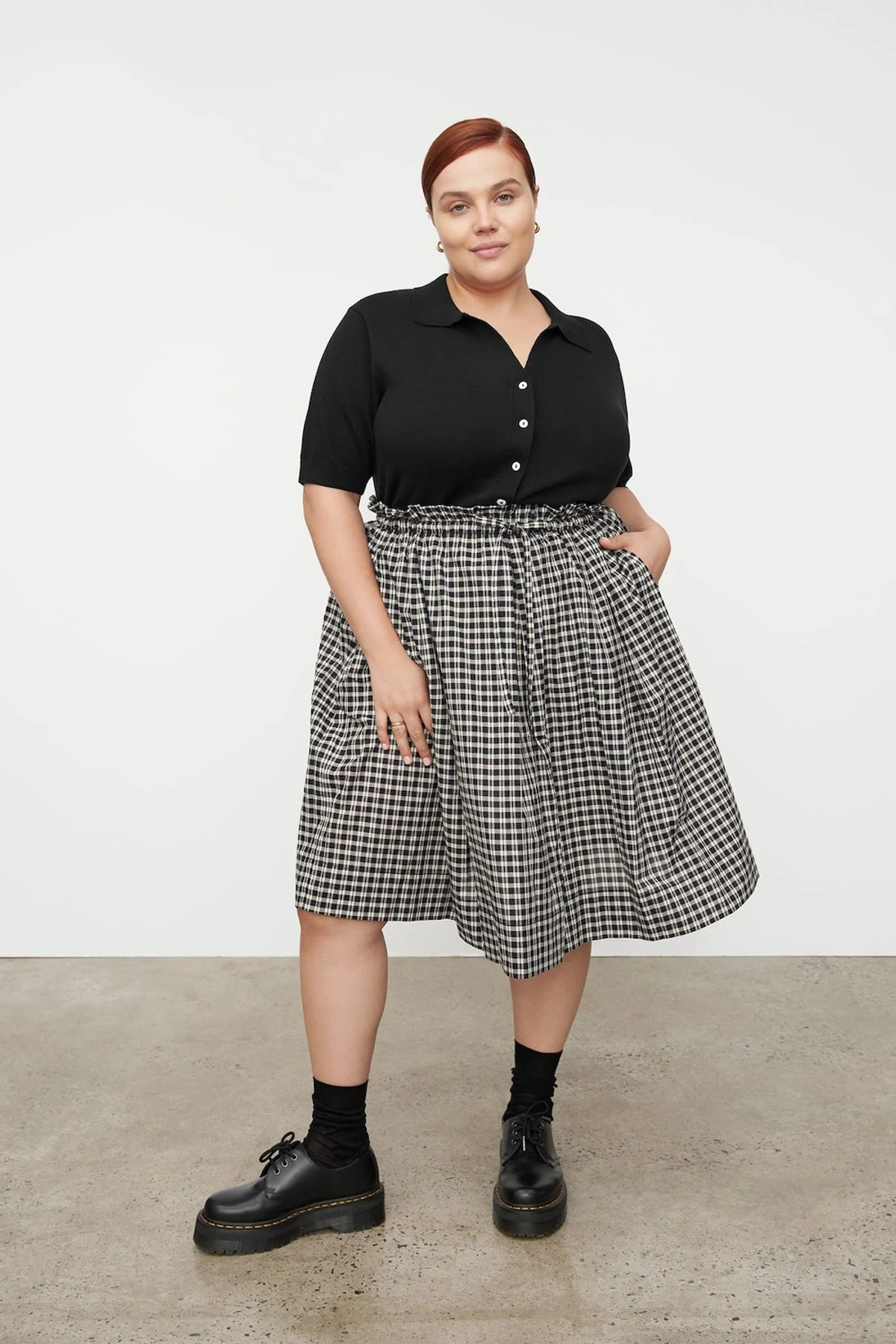 A knee length skirt, made from 100% certified Fairtrade lightweight organic cotton voile in our Monochrome Check. The Stevie Skirt is a mid-rise style with a relaxed fit. It has an elasticated paper bag waist with a drawcord for customisable wear, and inseam pockets.