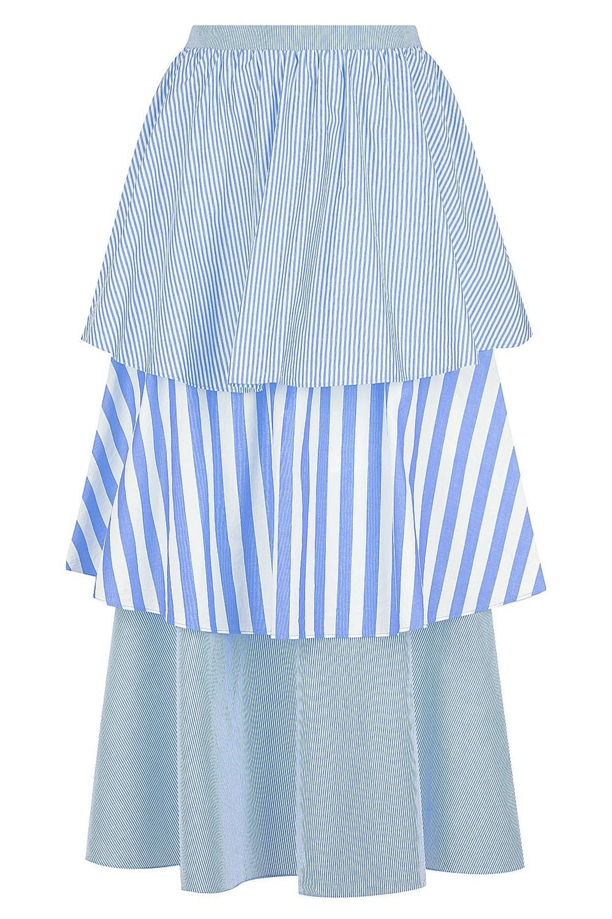 The Tiered Stripe Skirt is made from 100% pure cotton yarn. This playful garment features a stretched waistband and three tiers varying in patterns.